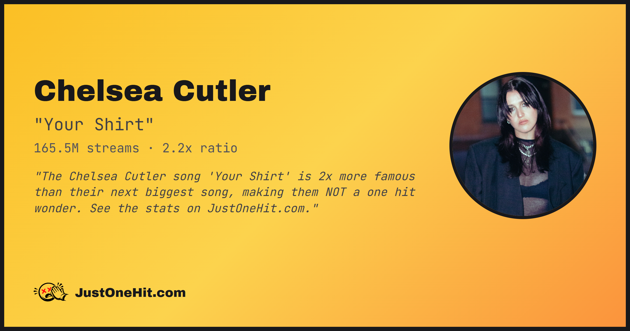 "The Chelsea Cutler song 'Your Shirt' is 2x more famous than their next biggest song, making them NOT a one hit wonder. See the stats on JustOneHit.com."