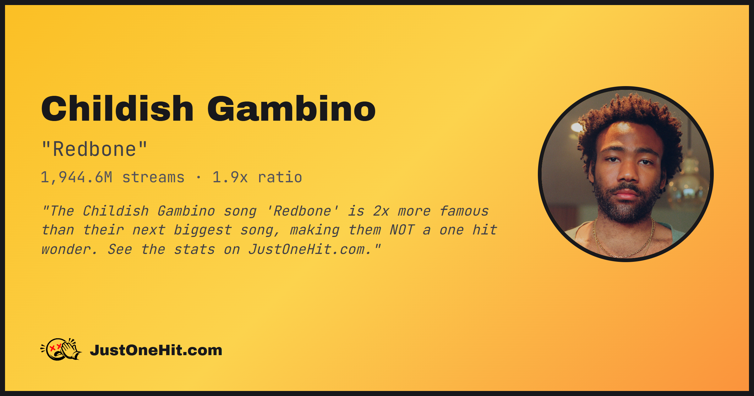 "The Childish Gambino song 'Redbone' is 2x more famous than their next biggest song, making them NOT a one hit wonder. See the stats on JustOneHit.com."