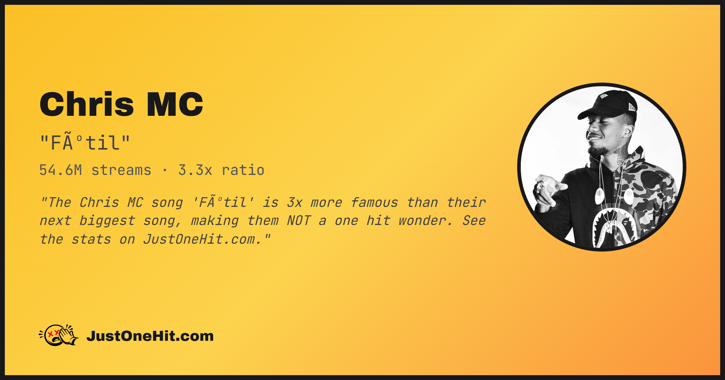 "The Chris MC song 'Fútil' is 3x more famous than their next biggest song, making them NOT a one hit wonder. See the stats on JustOneHit.com."