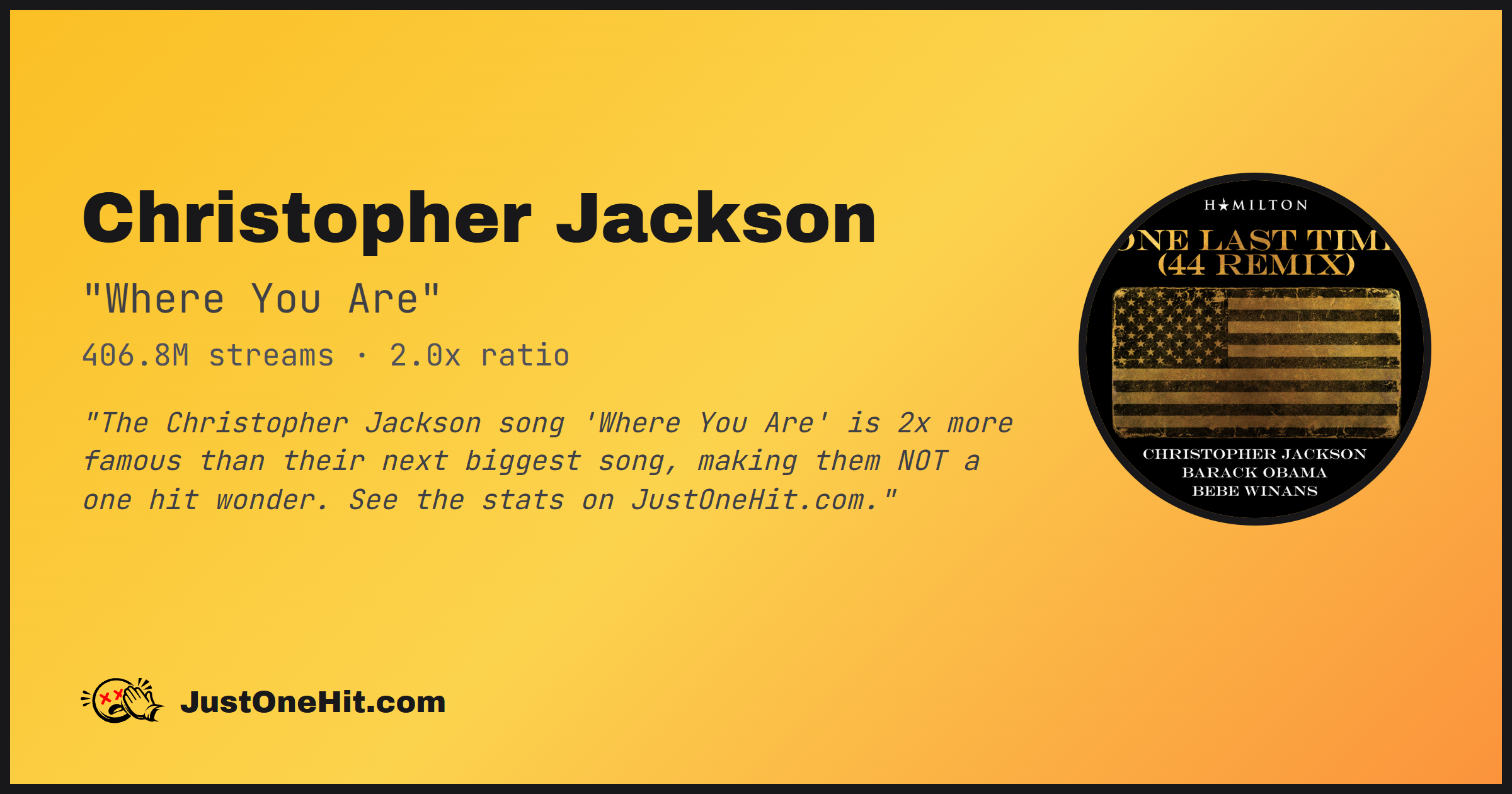 "The Christopher Jackson song 'Where You Are' is 2x more famous than their next biggest song, making them NOT a one hit wonder. See the stats on JustOneHit.com."