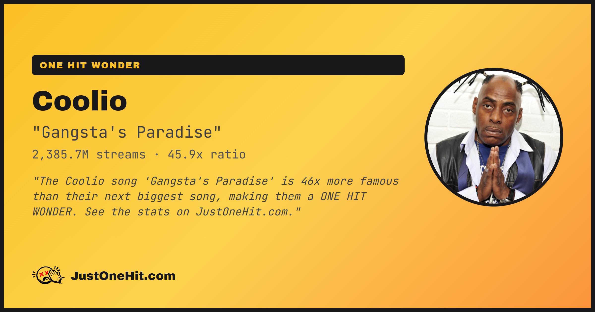 "The Coolio song 'Gangsta's Paradise' is 45x more famous than their next biggest song, making them a ONE HIT WONDER. See the stats on JustOneHit.com."