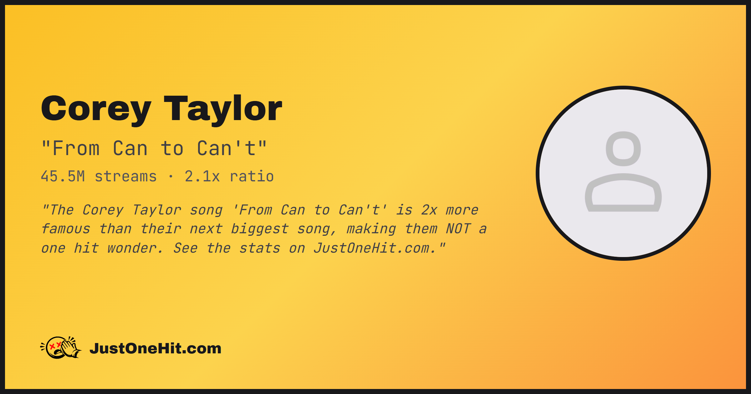 "The Corey Taylor song 'From Can to Can't' is 2x more famous than their next biggest song, making them NOT a one hit wonder. See the stats on JustOneHit.com."