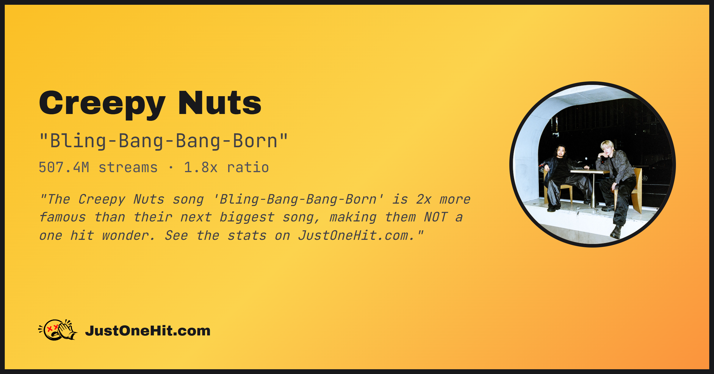 "The Creepy Nuts song 'Bling-Bang-Bang-Born' is 2x more famous than their next biggest song, making them NOT a one hit wonder. See the stats on JustOneHit.com."