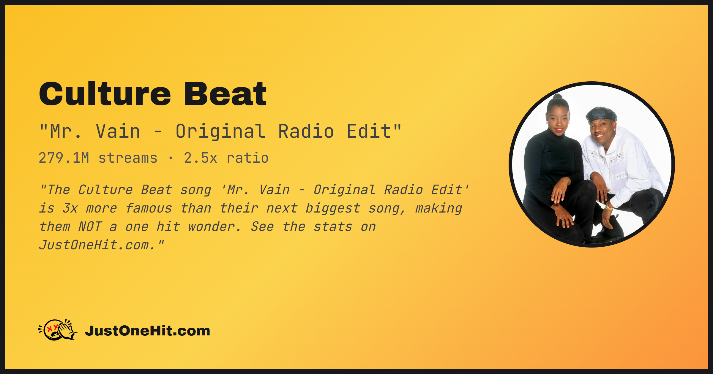"The Culture Beat song 'Mr. Vain - Original Radio Edit' is 2x more famous than their next biggest song, making them NOT a one hit wonder. See the stats on JustOneHit.com."