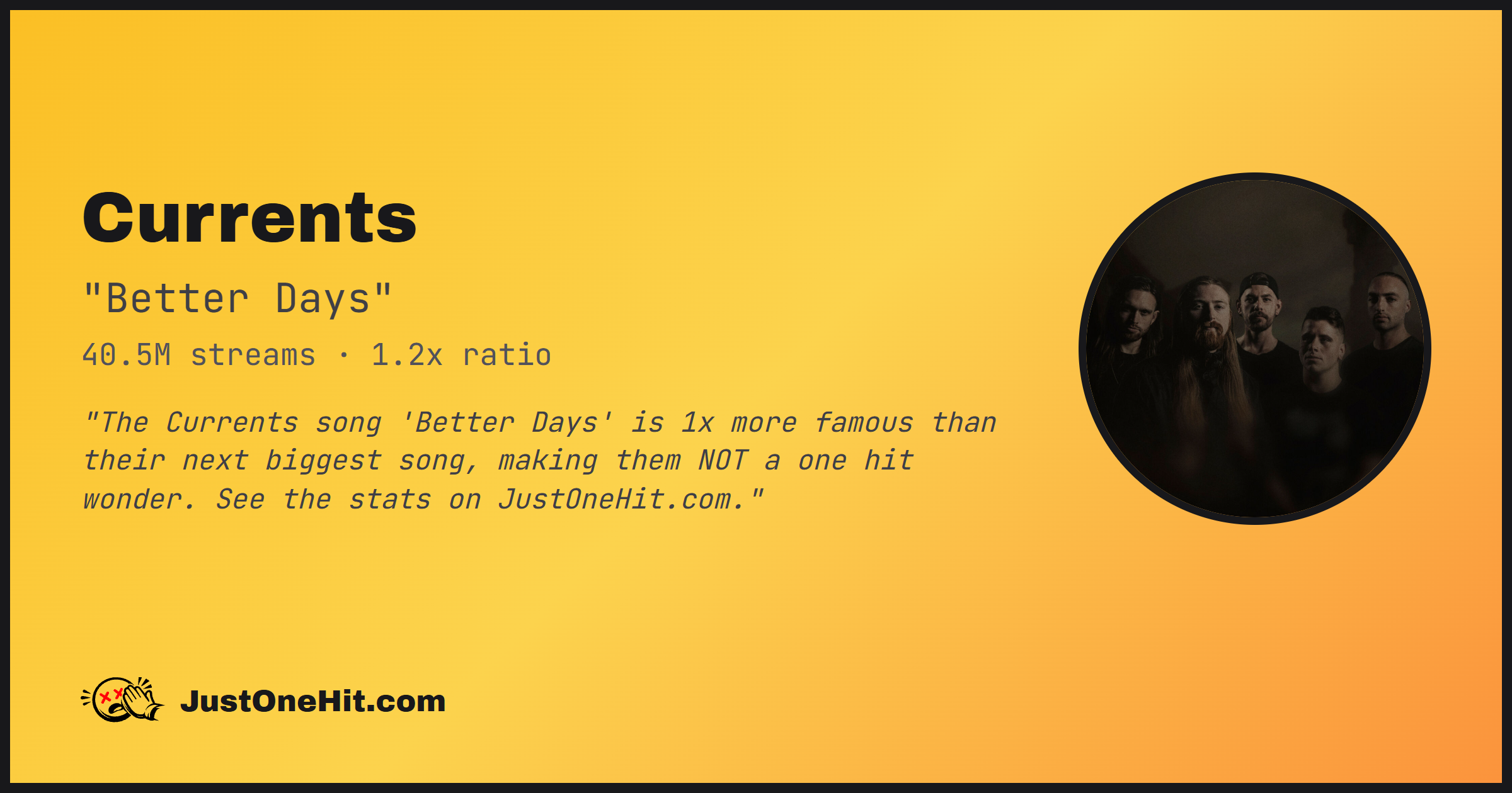 "The Currents song 'Better Days' is 1x more famous than their next biggest song, making them NOT a one hit wonder. See the stats on JustOneHit.com."