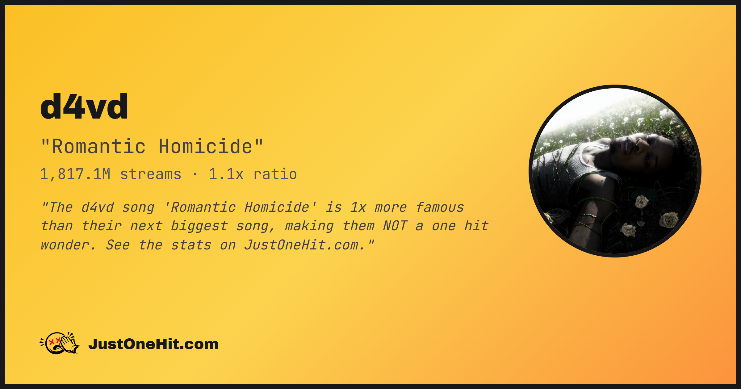 "The d4vd song 'Romantic Homicide' is 1x more famous than their next biggest song, making them NOT a one hit wonder. See the stats on JustOneHit.com."
