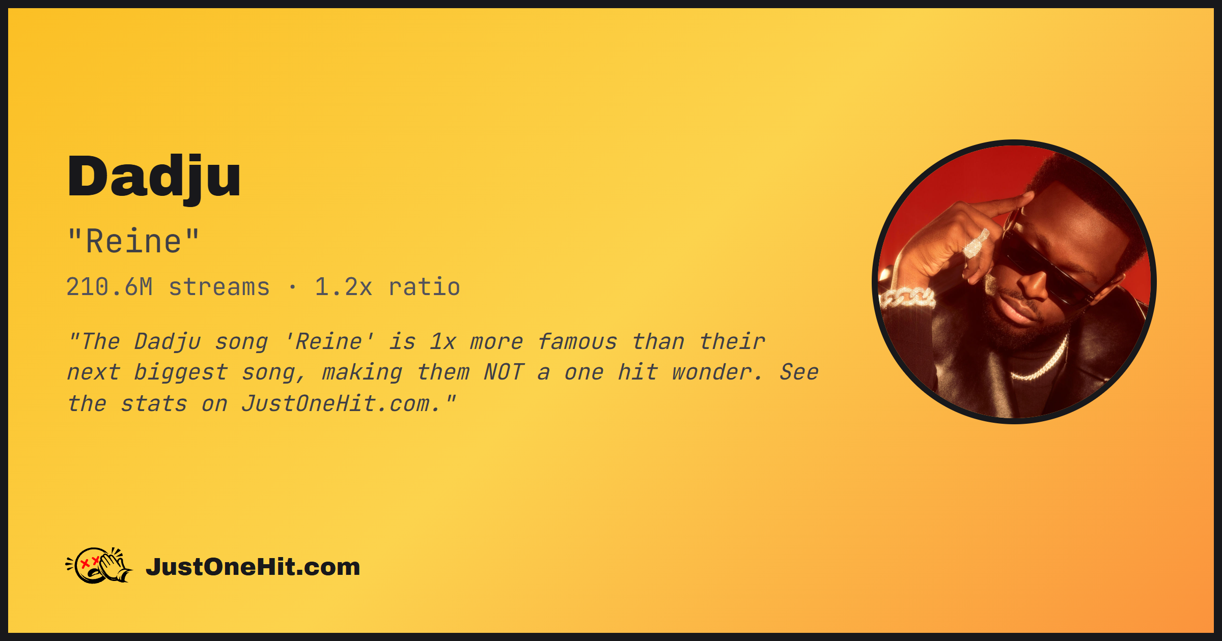 "The Dadju song 'Reine' is 1x more famous than their next biggest song, making them NOT a one hit wonder. See the stats on JustOneHit.com."