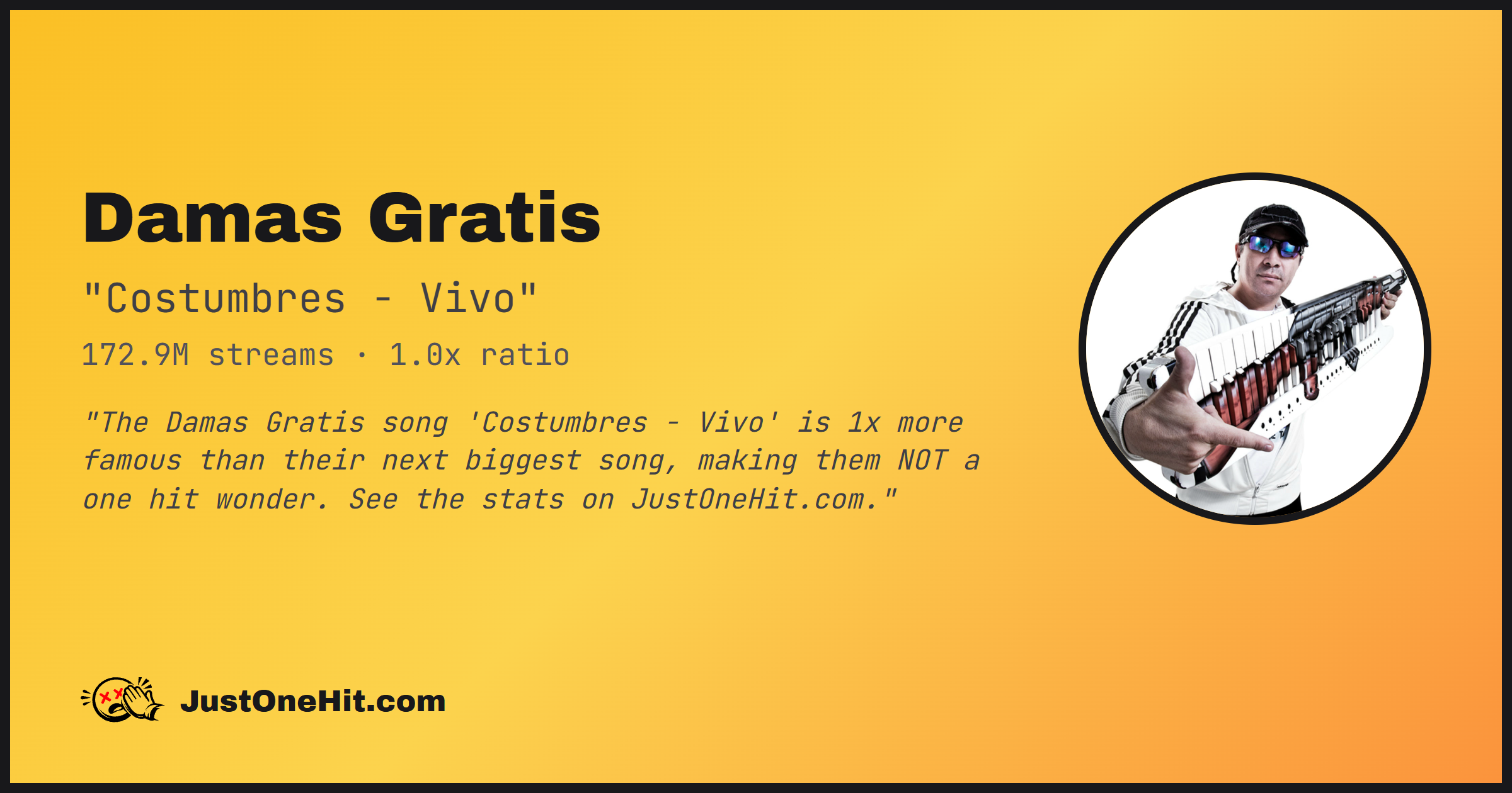 "The Damas Gratis song 'Costumbres - Vivo' is 1x more famous than their next biggest song, making them NOT a one hit wonder. See the stats on JustOneHit.com."
