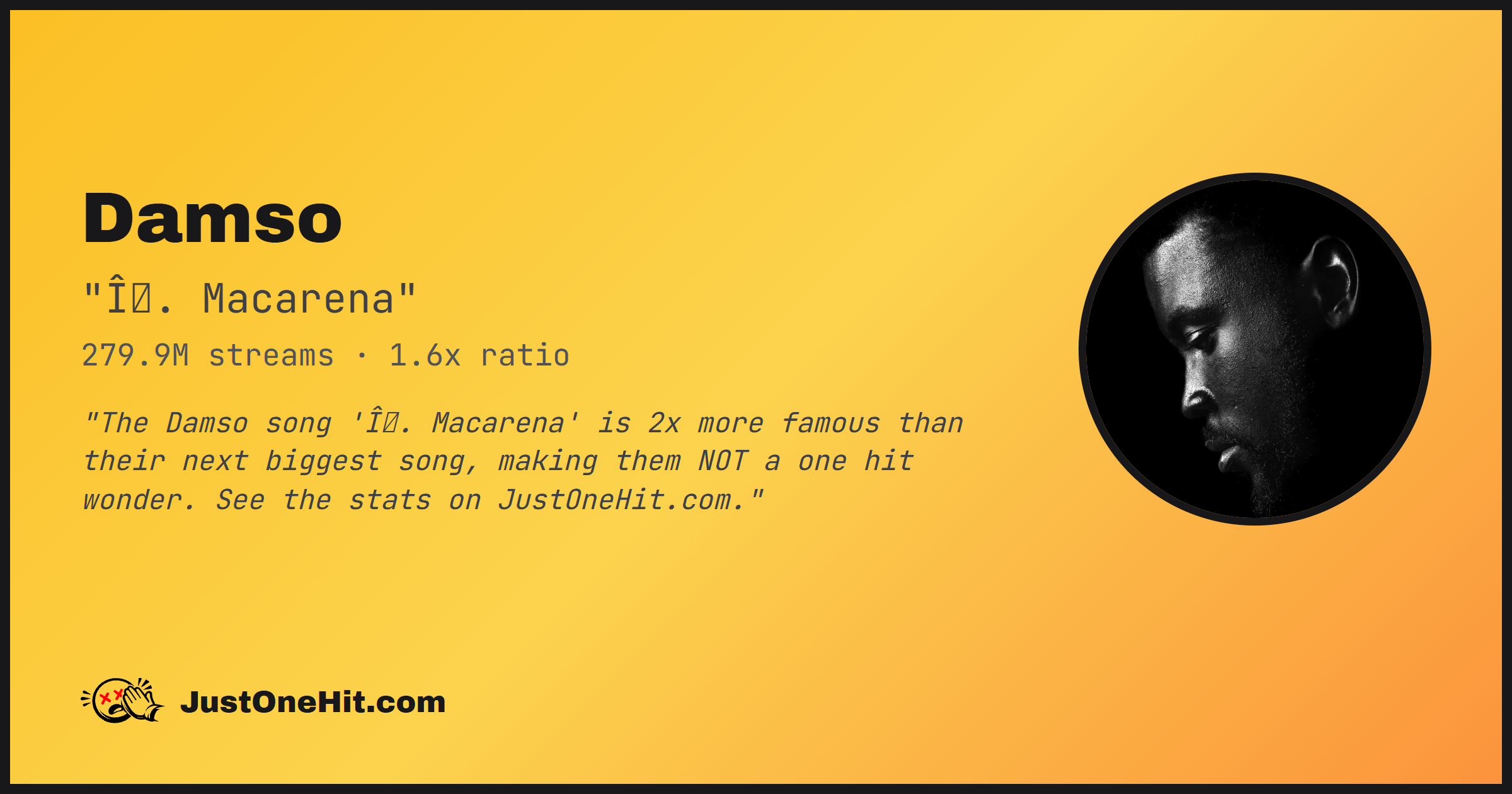 "The Damso song 'Î. Macarena' is 2x more famous than their next biggest song, making them NOT a one hit wonder. See the stats on JustOneHit.com."