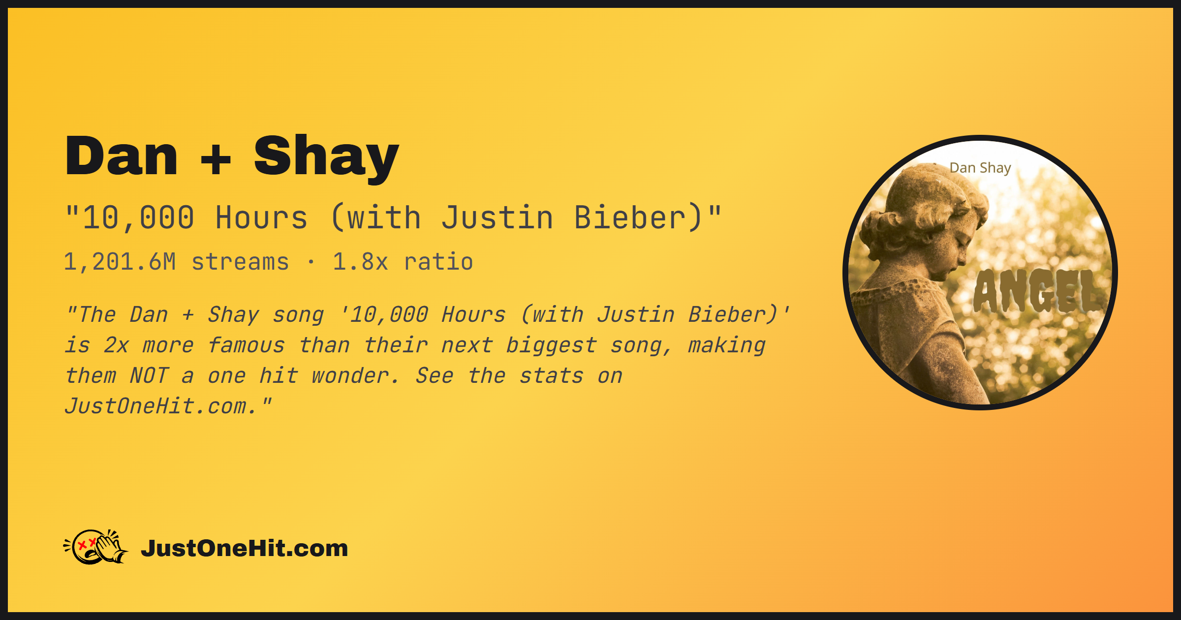 "The Dan + Shay song '10,000 Hours (with Justin Bieber)' is 2x more famous than their next biggest song, making them NOT a one hit wonder. See the stats on JustOneHit.com."