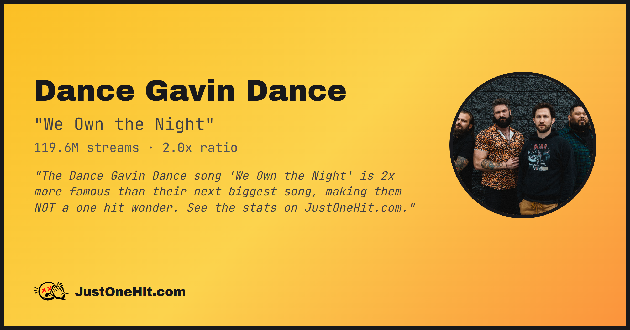 "The Dance Gavin Dance song 'We Own the Night' is 2x more famous than their next biggest song, making them NOT a one hit wonder. See the stats on JustOneHit.com."