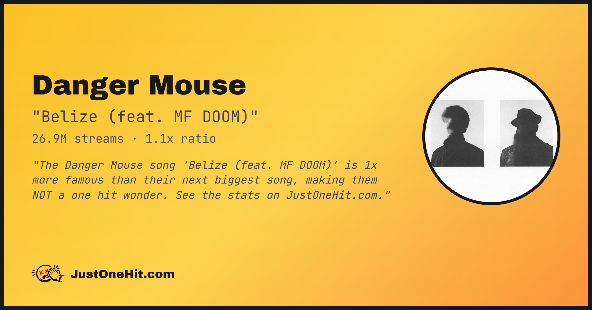 "The Danger Mouse song 'Belize (feat. MF DOOM)' is 1x more famous than their next biggest song, making them NOT a one hit wonder. See the stats on JustOneHit.com."