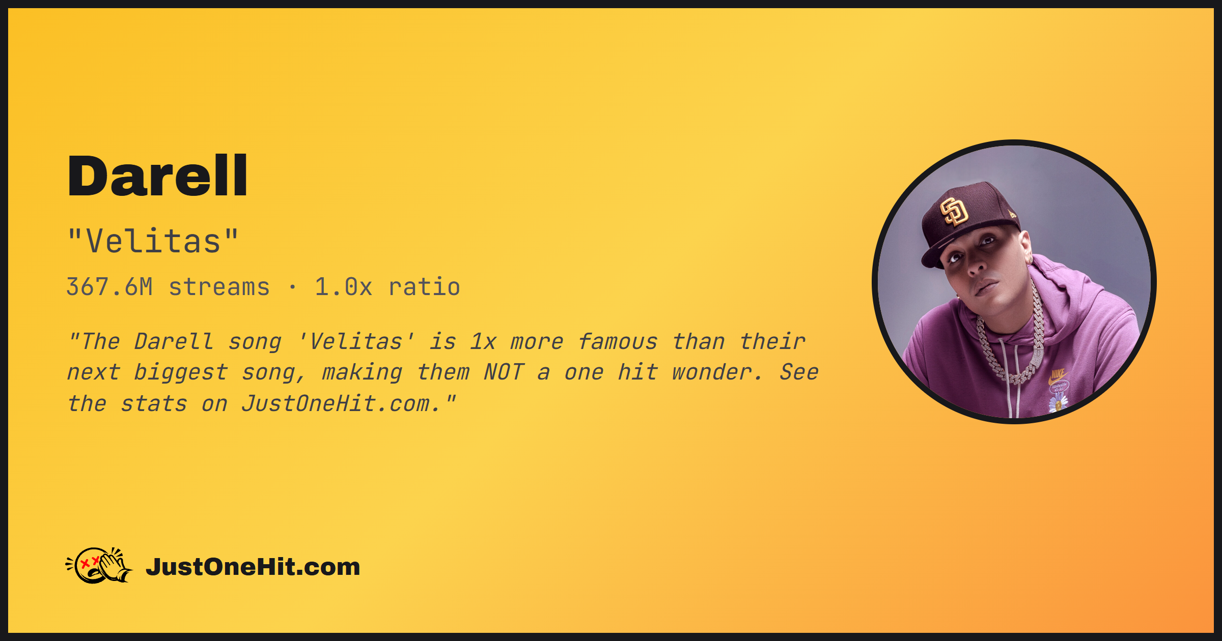 "The Darell song 'Velitas' is 1x more famous than their next biggest song, making them NOT a one hit wonder. See the stats on JustOneHit.com."