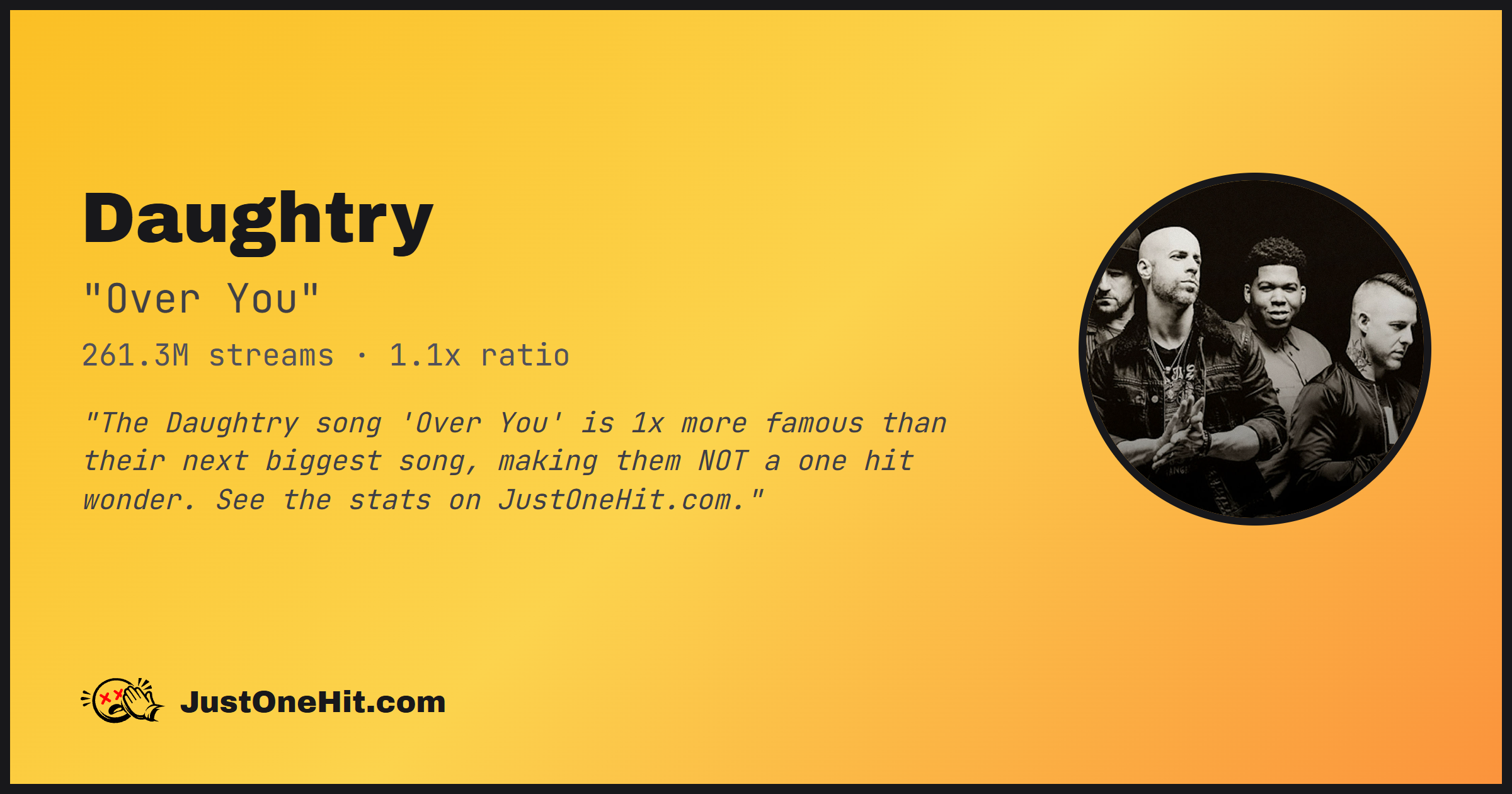 "The Daughtry song 'Over You' is 1x more famous than their next biggest song, making them NOT a one hit wonder. See the stats on JustOneHit.com."