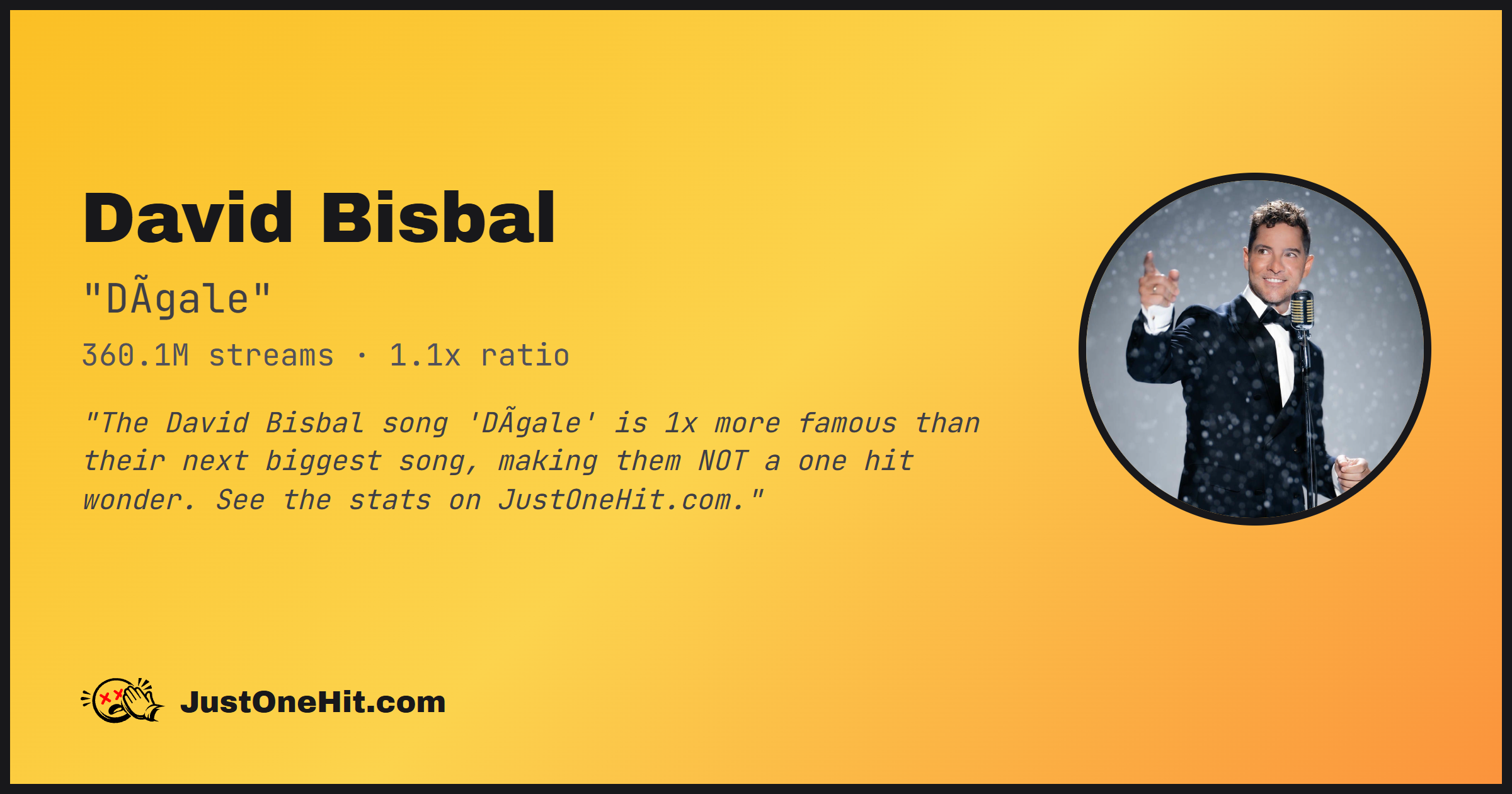 "The David Bisbal song 'DÃgale' is 1x more famous than their next biggest song, making them NOT a one hit wonder. See the stats on JustOneHit.com."