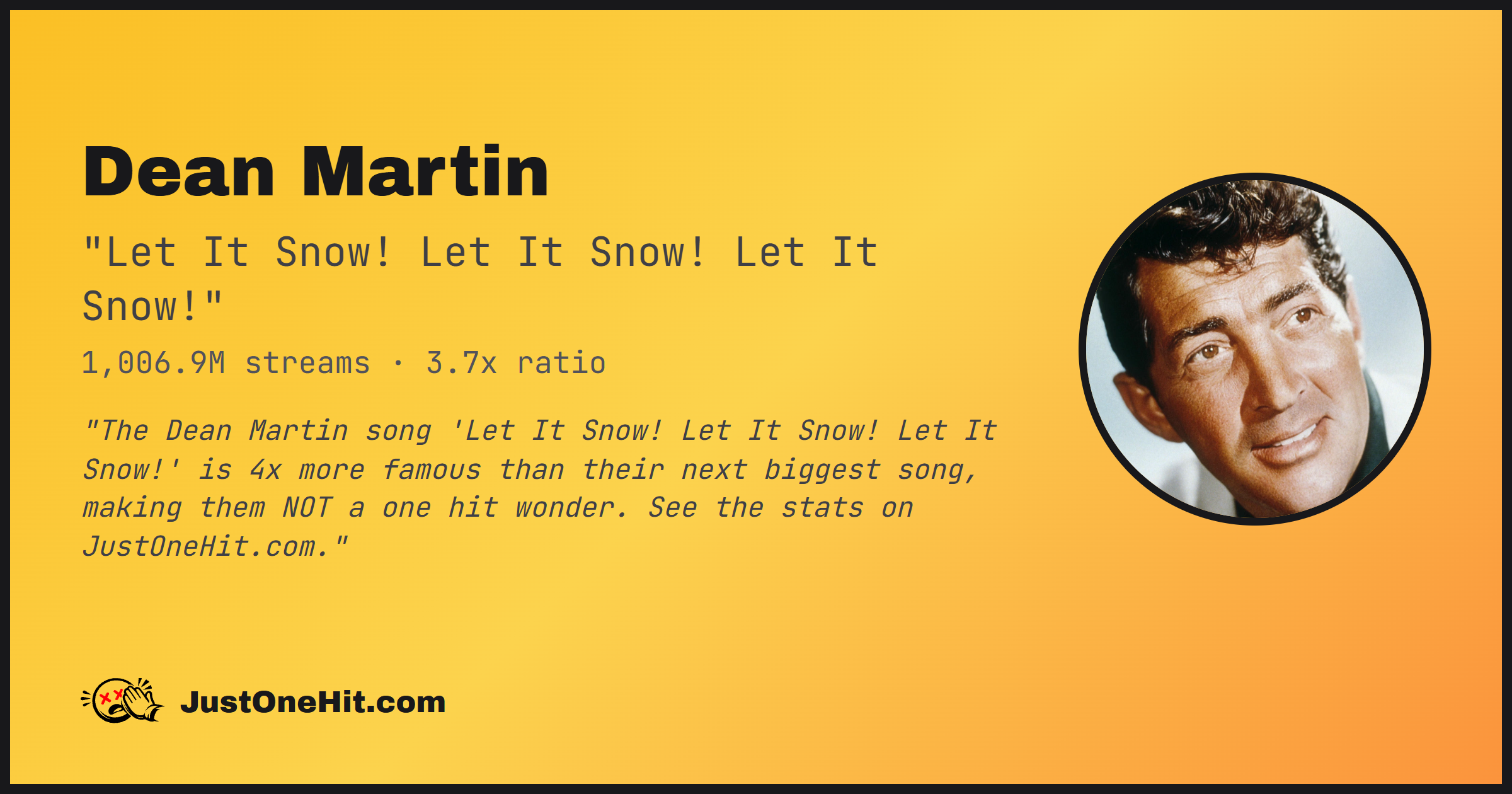"The Dean Martin song 'Let It Snow! Let It Snow! Let It Snow!' is 4x more famous than their next biggest song, making them NOT a one hit wonder. See the stats on JustOneHit.com."