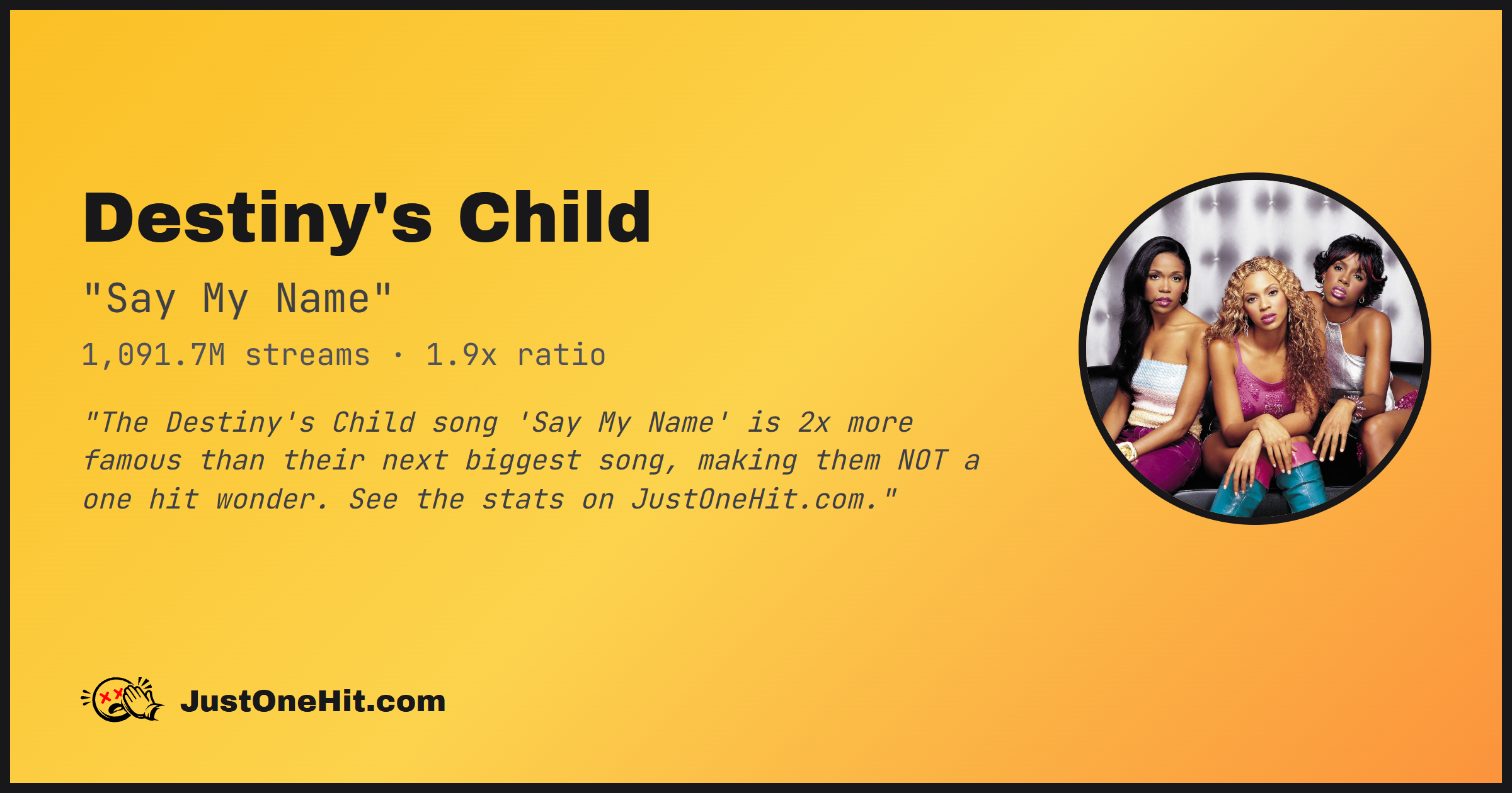 "The Destiny's Child song 'Say My Name' is 2x more famous than their next biggest song, making them NOT a one hit wonder. See the stats on JustOneHit.com."
