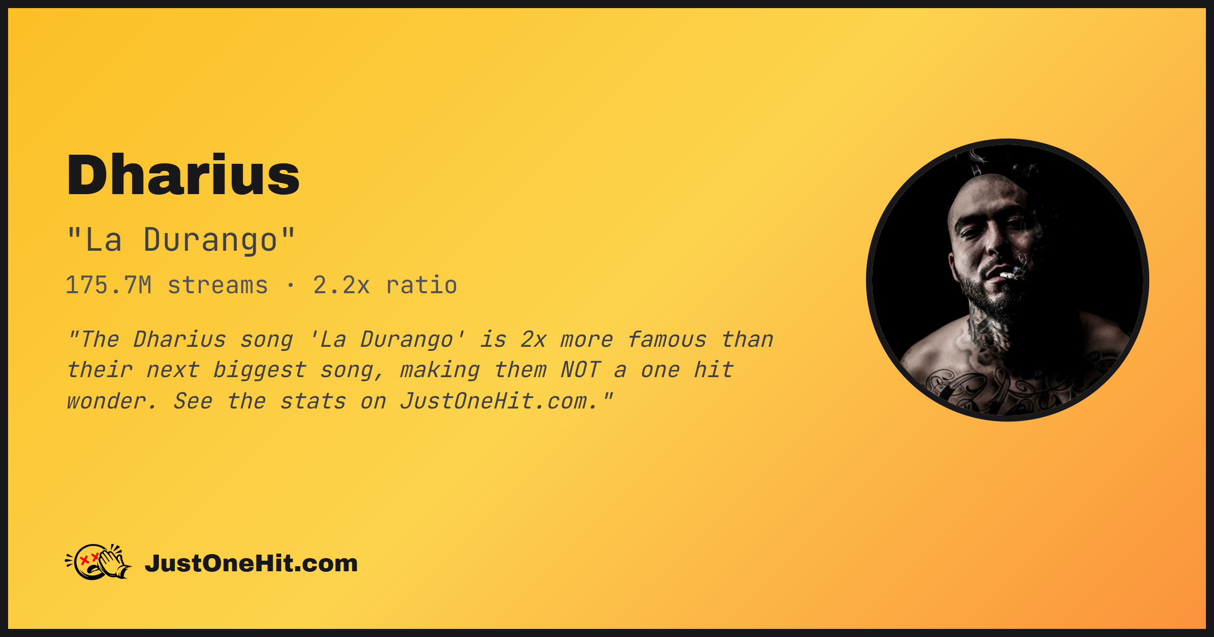 "The Dharius song 'La Durango' is 2x more famous than their next biggest song, making them NOT a one hit wonder. See the stats on JustOneHit.com."