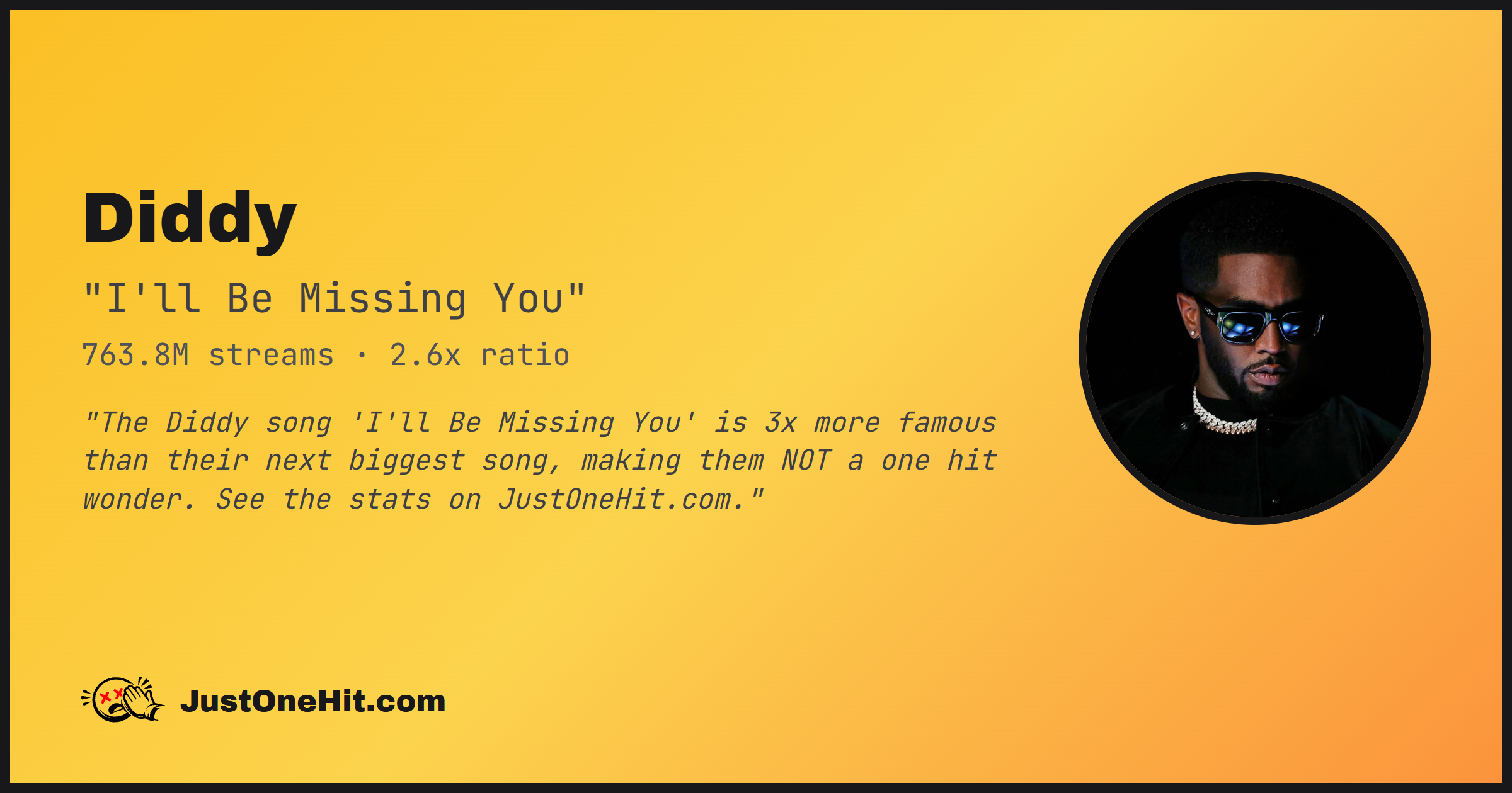 "The Diddy song 'I'll Be Missing You' is 3x more famous than their next biggest song, making them NOT a one hit wonder. See the stats on JustOneHit.com."