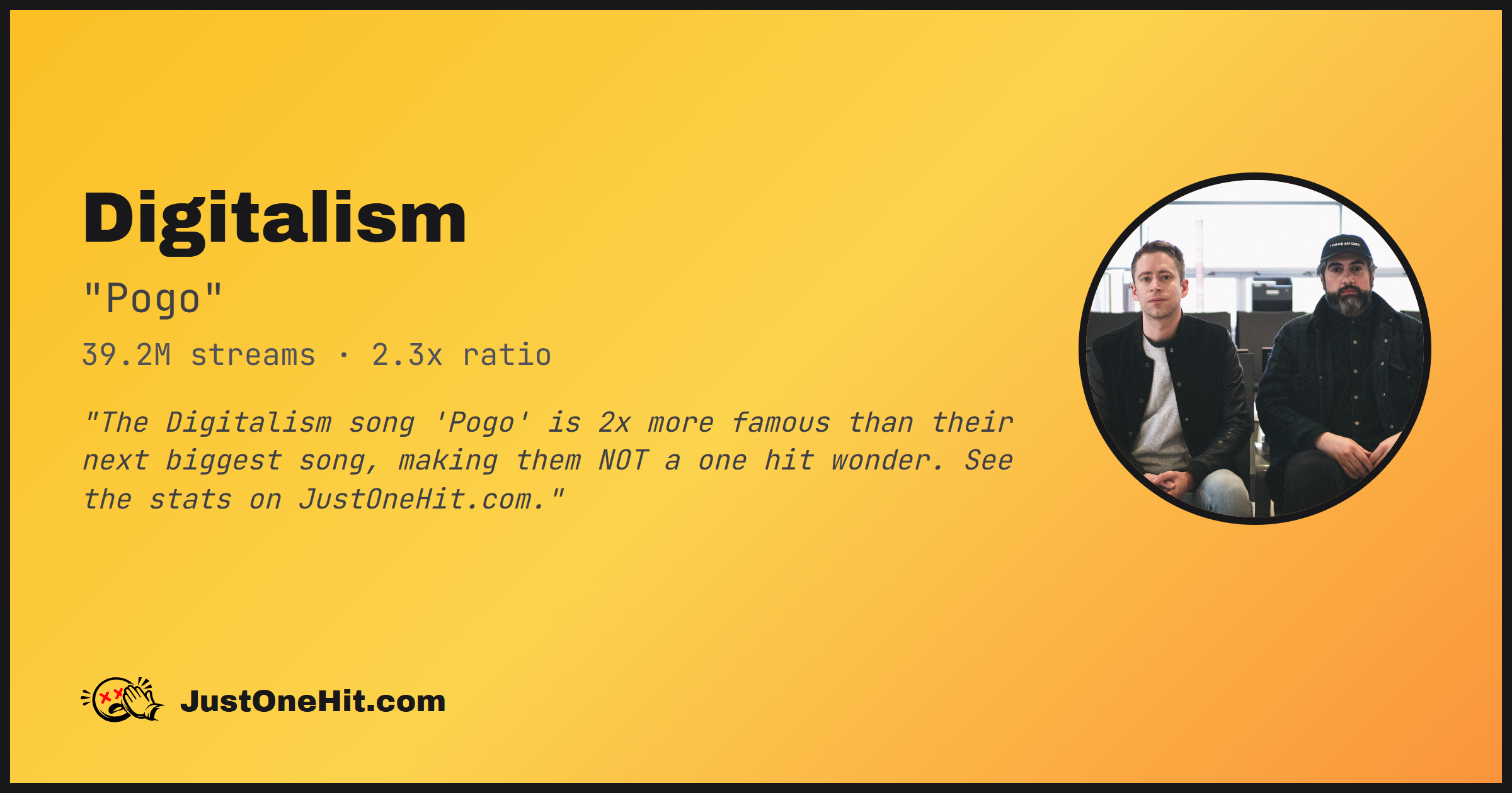 "The Digitalism song 'Pogo' is 2x more famous than their next biggest song, making them NOT a one hit wonder. See the stats on JustOneHit.com."