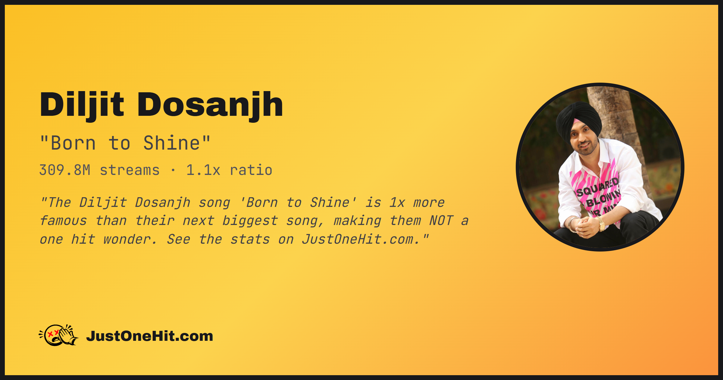 "The Diljit Dosanjh song 'Born to Shine' is 1x more famous than their next biggest song, making them NOT a one hit wonder. See the stats on JustOneHit.com."