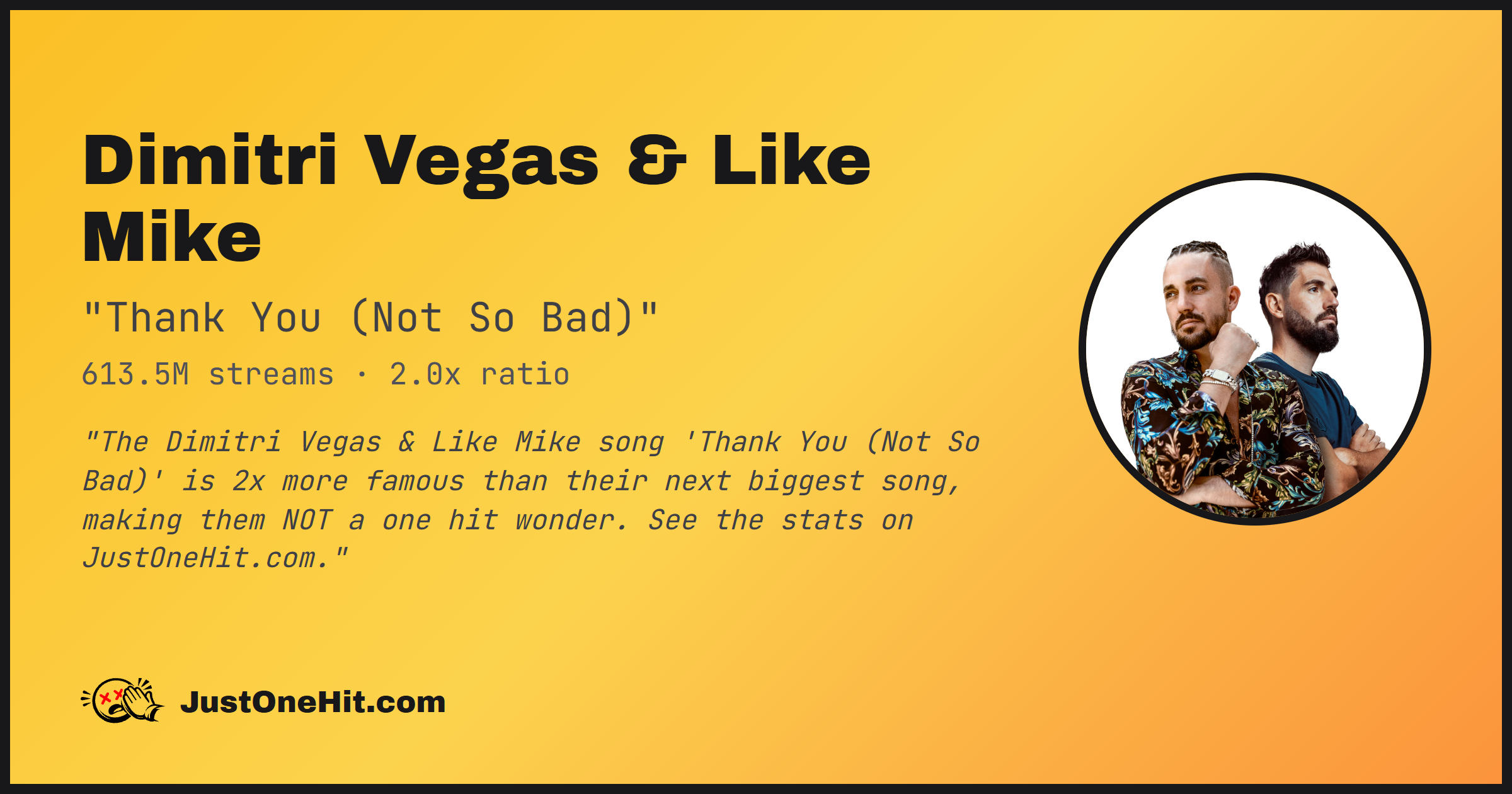 "The Dimitri Vegas & Like Mike song 'Thank You (Not So Bad)' is 2x more famous than their next biggest song, making them NOT a one hit wonder. See the stats on JustOneHit.com."