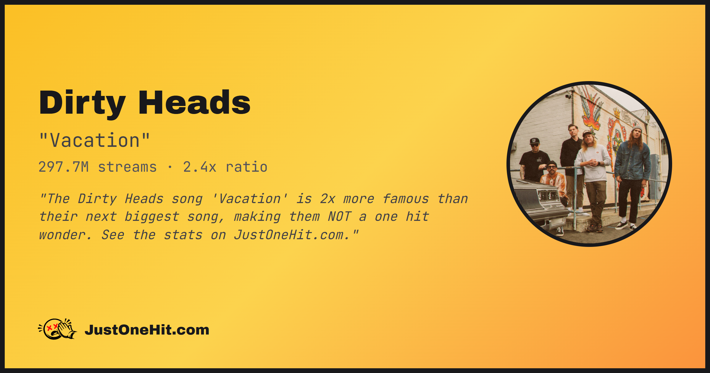 "The Dirty Heads song 'Vacation' is 2x more famous than their next biggest song, making them NOT a one hit wonder. See the stats on JustOneHit.com."