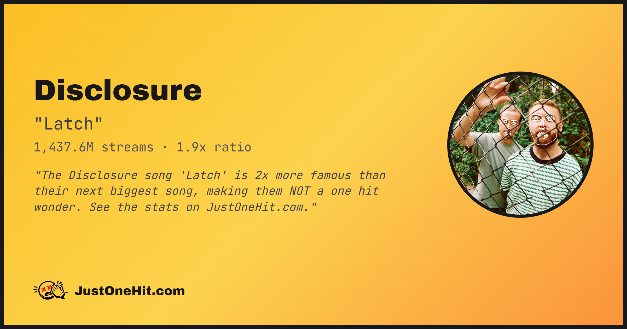 "The Disclosure song 'Latch' is 2x more famous than their next biggest song, making them NOT a one hit wonder. See the stats on JustOneHit.com."