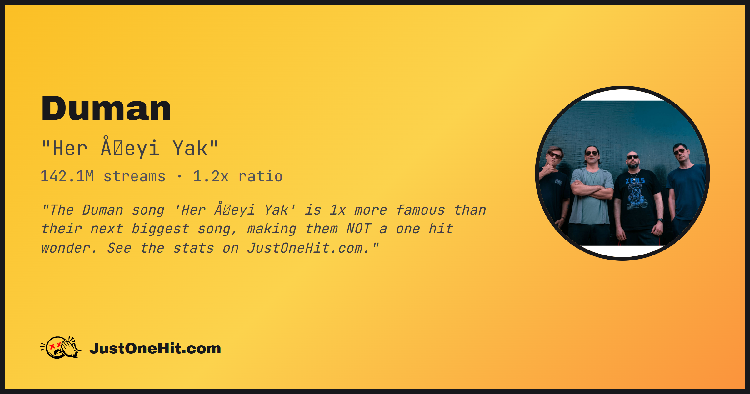 "The Duman song 'Her Åeyi Yak' is 1x more famous than their next biggest song, making them NOT a one hit wonder. See the stats on JustOneHit.com."