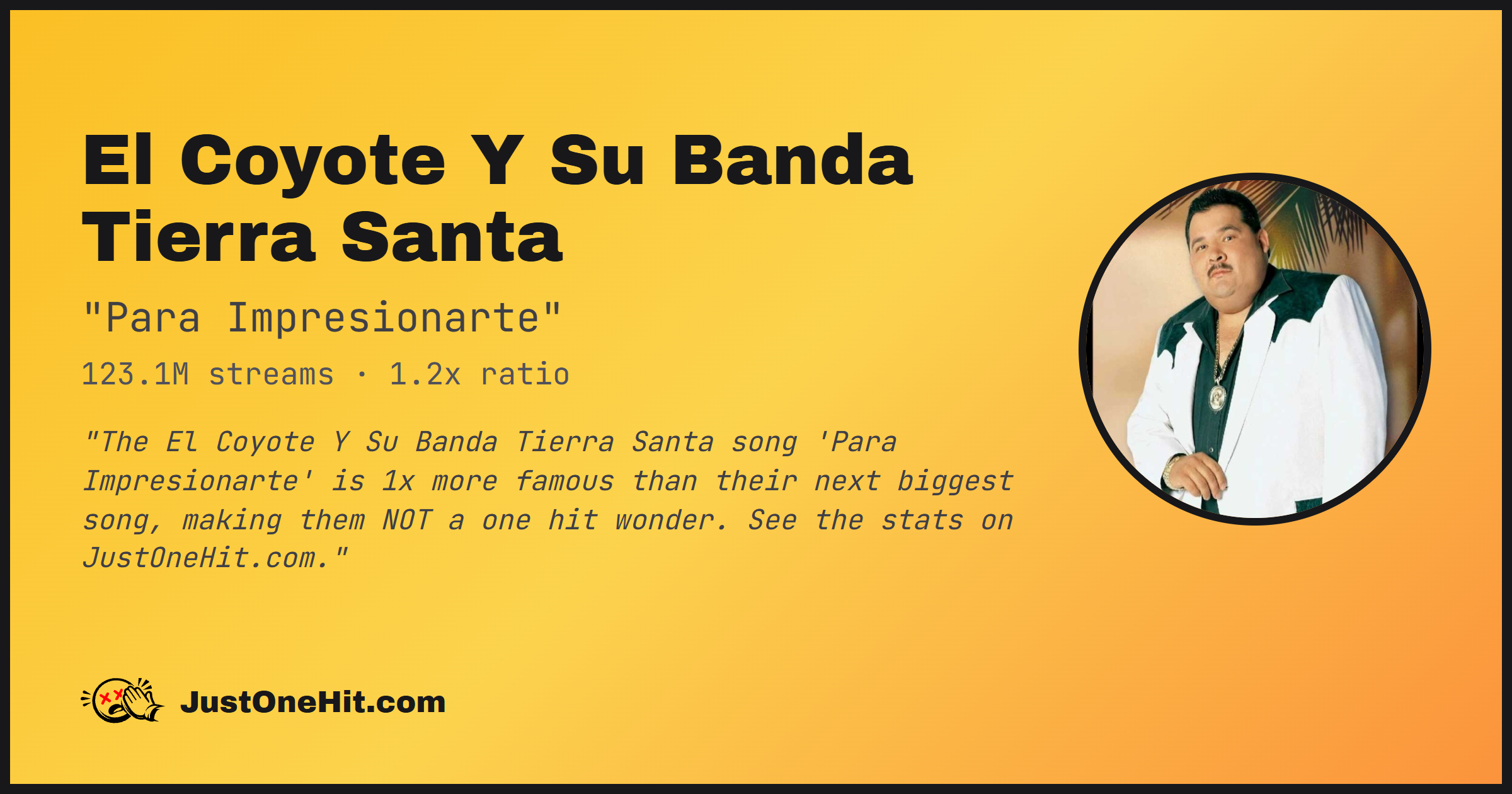 "The El Coyote Y Su Banda Tierra Santa song 'Para Impresionarte' is 1x more famous than their next biggest song, making them NOT a one hit wonder. See the stats on JustOneHit.com."
