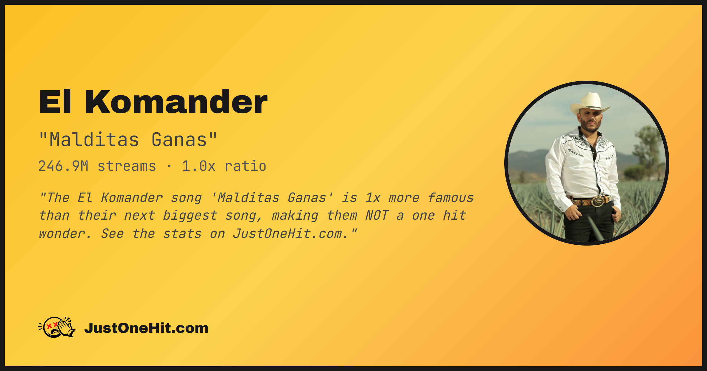 "The El Komander song 'El Taquicardio' is 1x more famous than their next biggest song, making them NOT a one hit wonder. See the stats on JustOneHit.com."