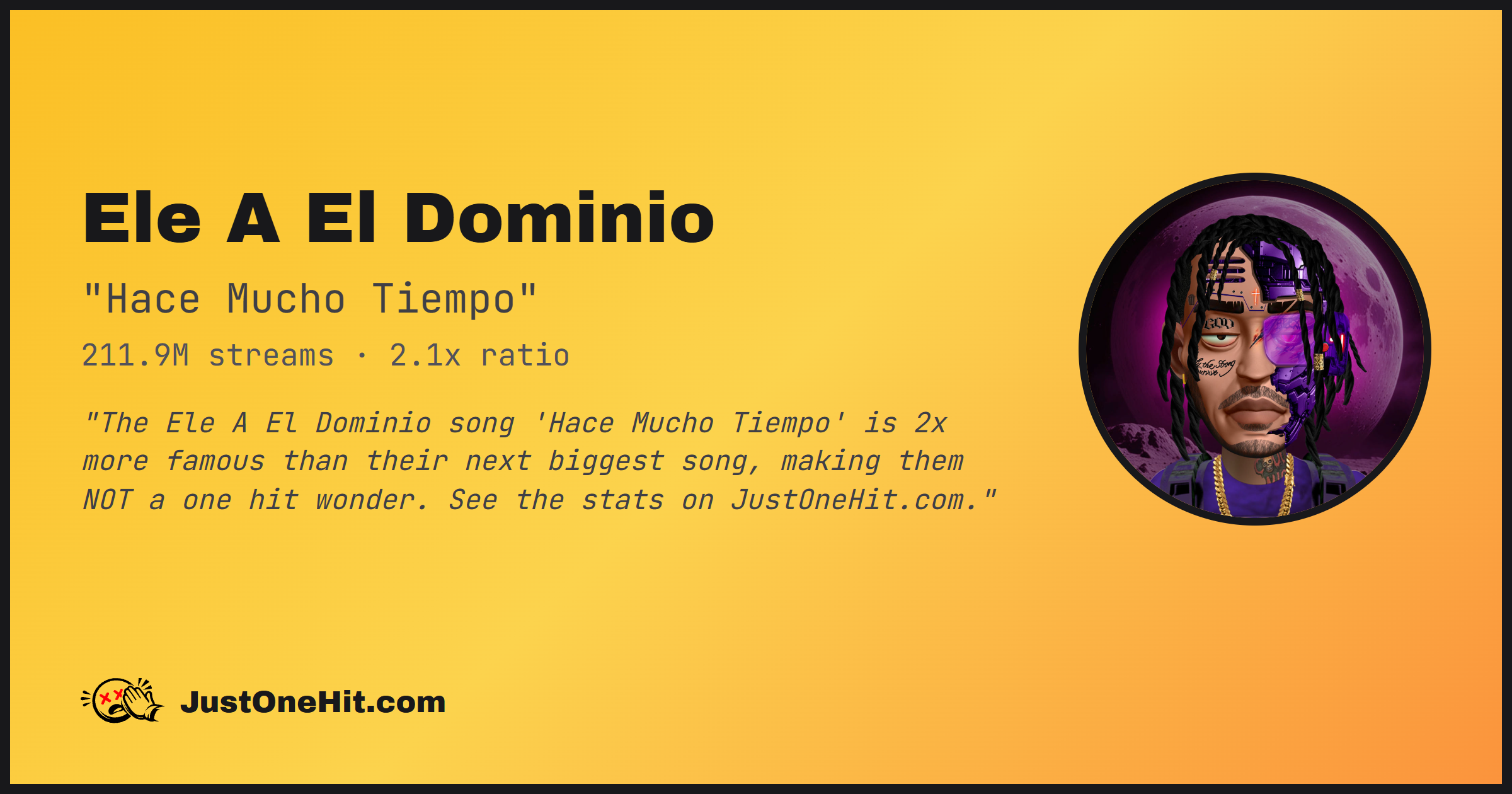 "The Ele A El Dominio song 'Hace Mucho Tiempo' is 2x more famous than their next biggest song, making them NOT a one hit wonder. See the stats on JustOneHit.com."