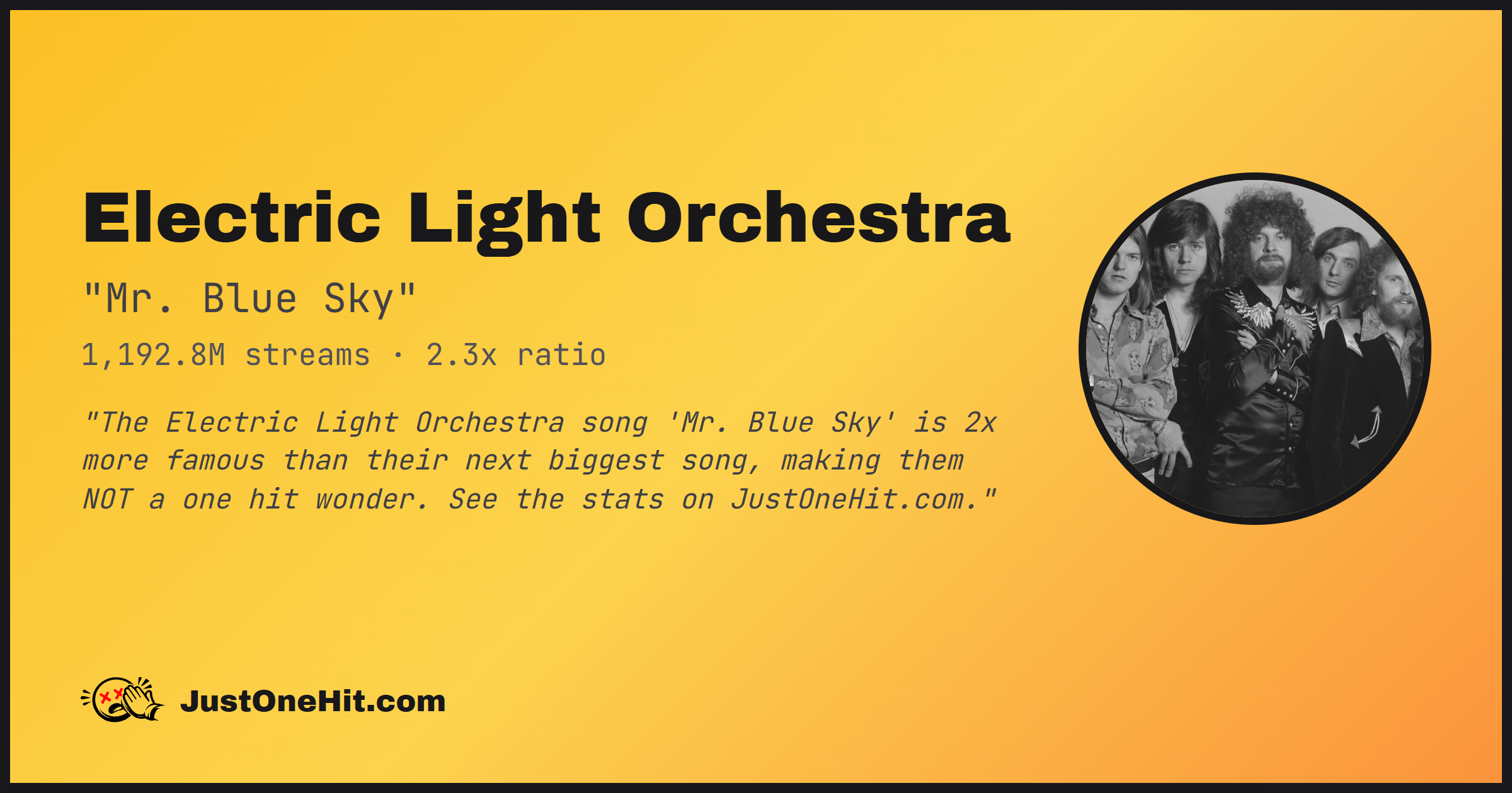 "The Electric Light Orchestra song 'Mr. Blue Sky' is 2x more famous than their next biggest song, making them NOT a one hit wonder. See the stats on JustOneHit.com."