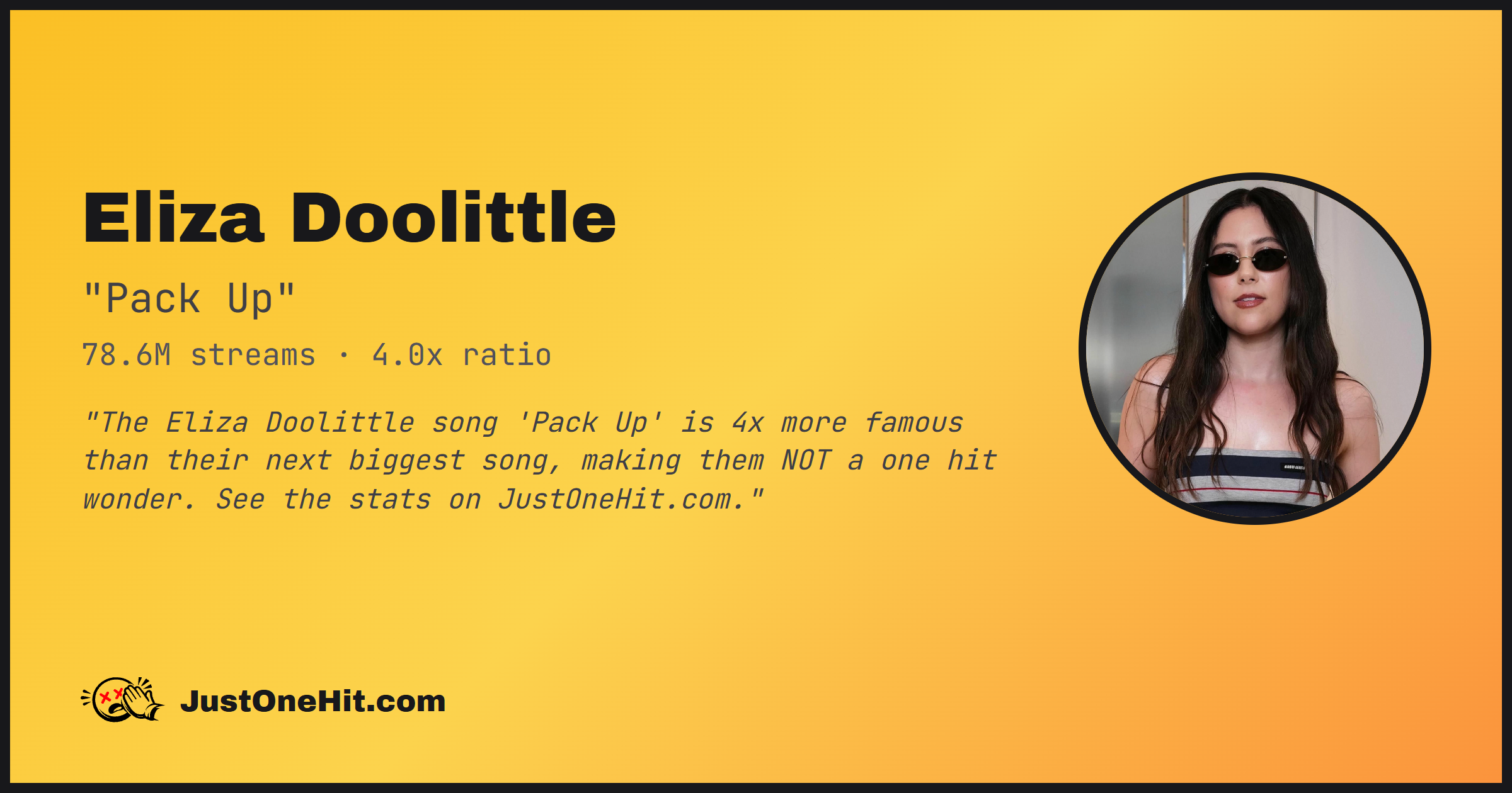 "The Eliza Doolittle song 'Pack Up' is 4x more famous than their next biggest song, making them NOT a one hit wonder. See the stats on JustOneHit.com."
