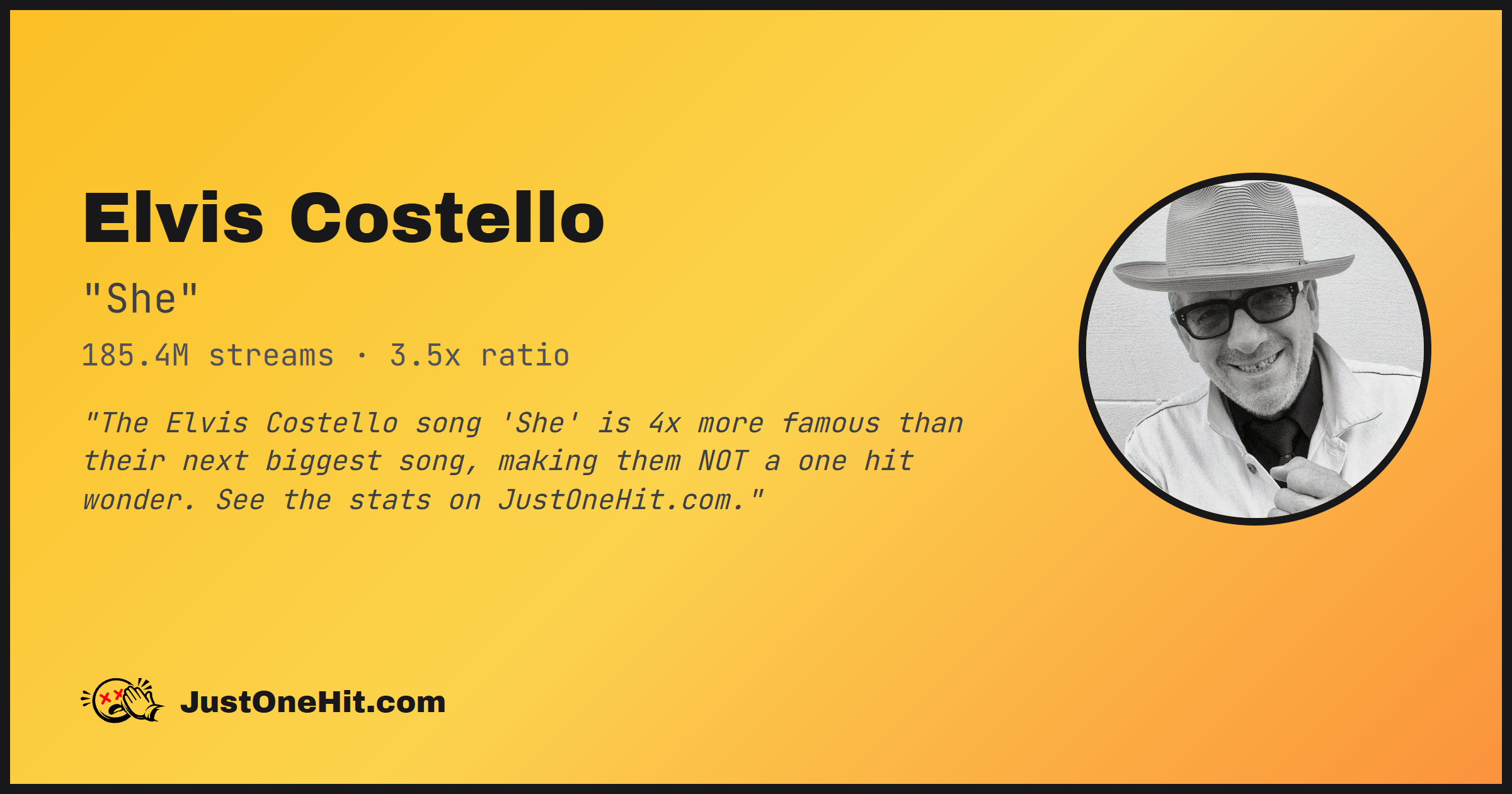 "The Elvis Costello song 'She' is 4x more famous than their next biggest song, making them NOT a one hit wonder. See the stats on JustOneHit.com."