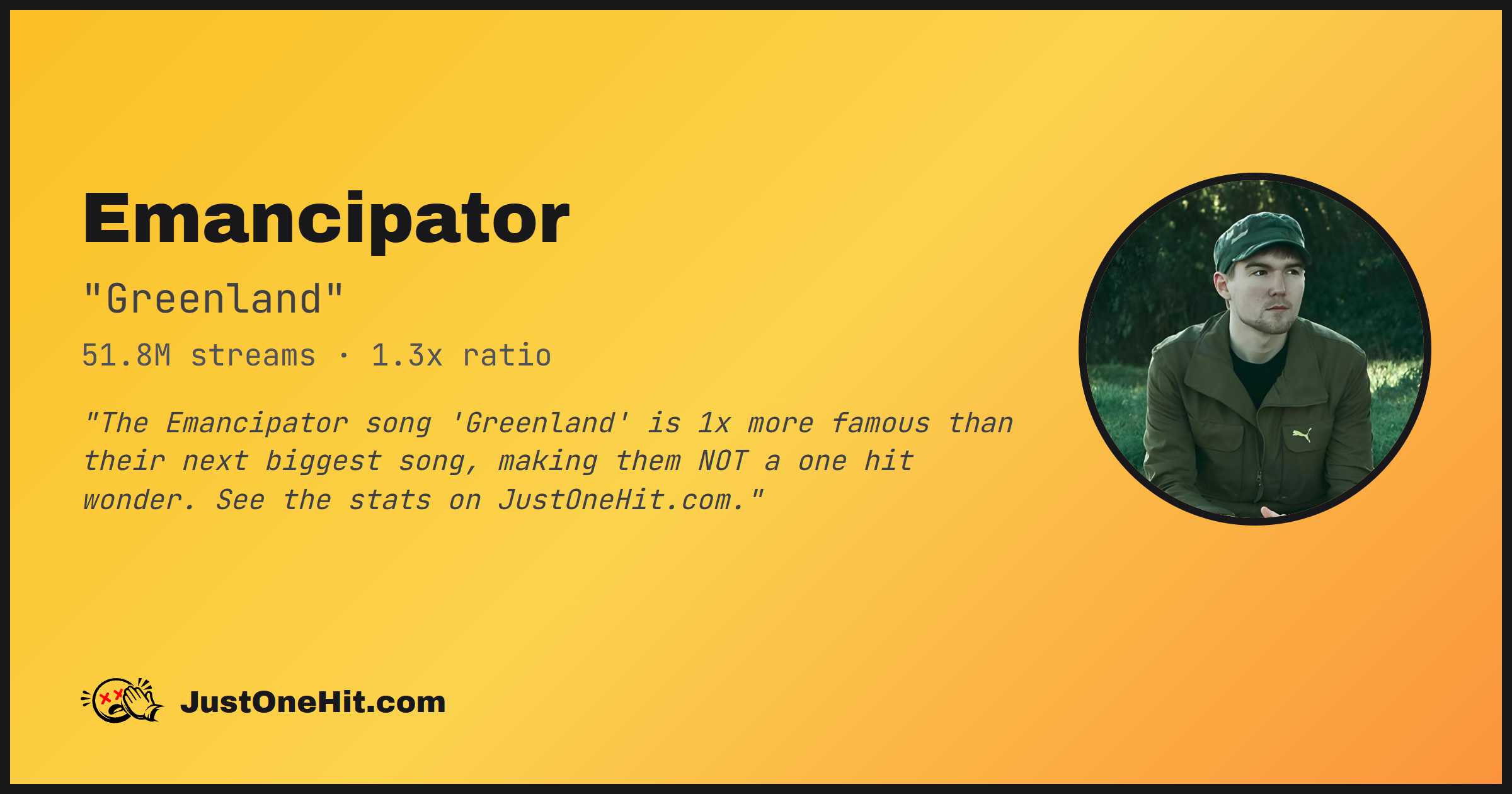 "The Emancipator song 'Greenland' is 1x more famous than their next biggest song, making them NOT a one hit wonder. See the stats on JustOneHit.com."