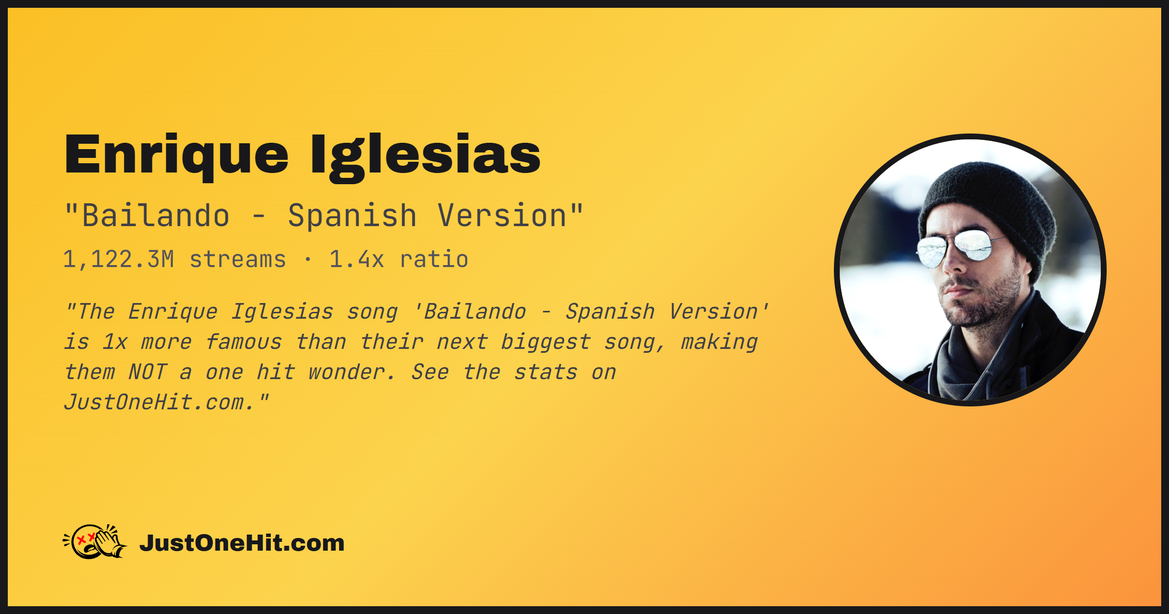 "The Enrique Iglesias song 'Bailando - Spanish Version' is 1x more famous than their next biggest song, making them NOT a one hit wonder. See the stats on JustOneHit.com."