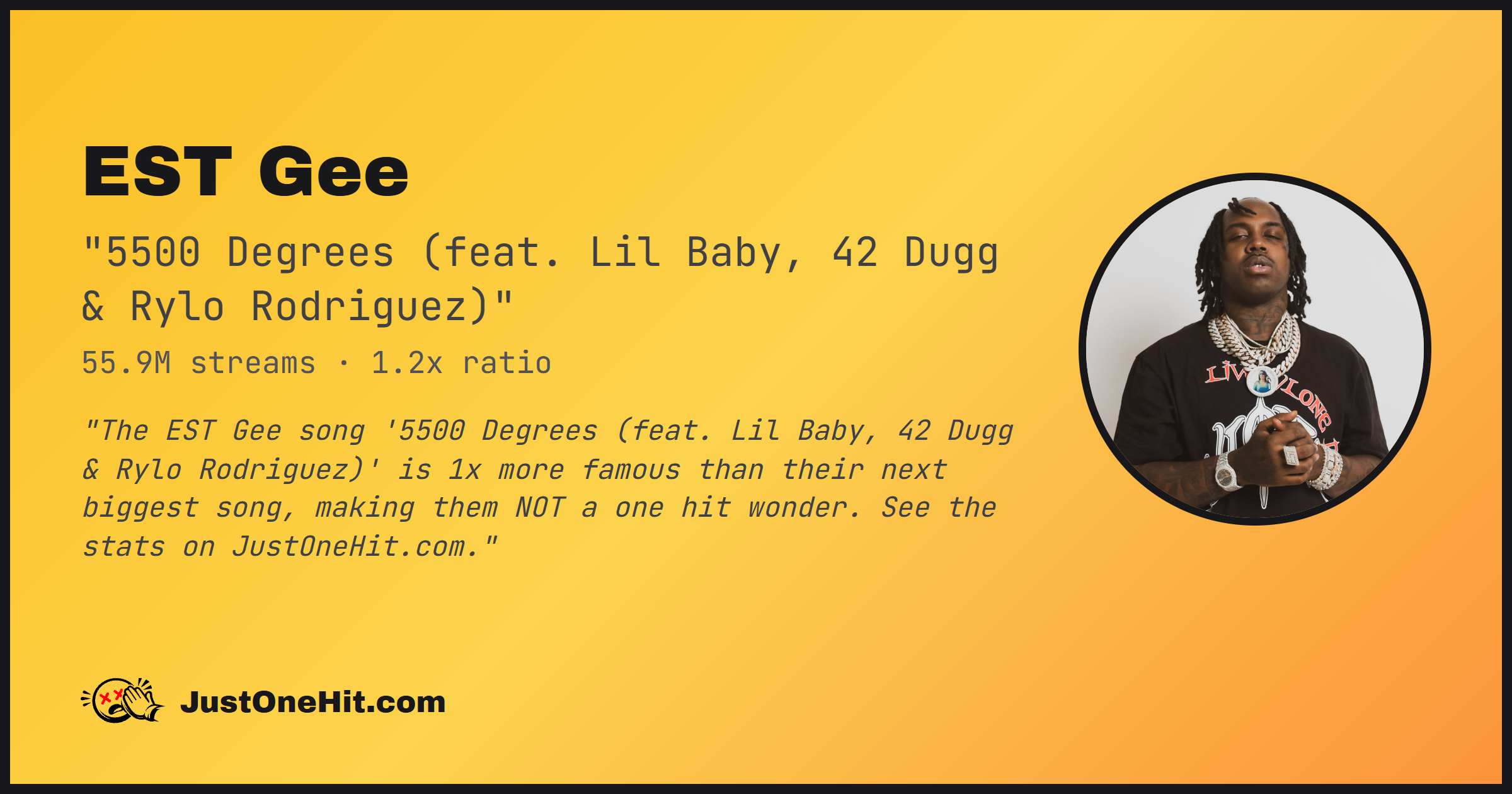 "The EST Gee song '5500 Degrees (feat. Lil Baby, 42 Dugg & Rylo Rodriguez)' is 1x more famous than their next biggest song, making them NOT a one hit wonder. See the stats on JustOneHit.com."
