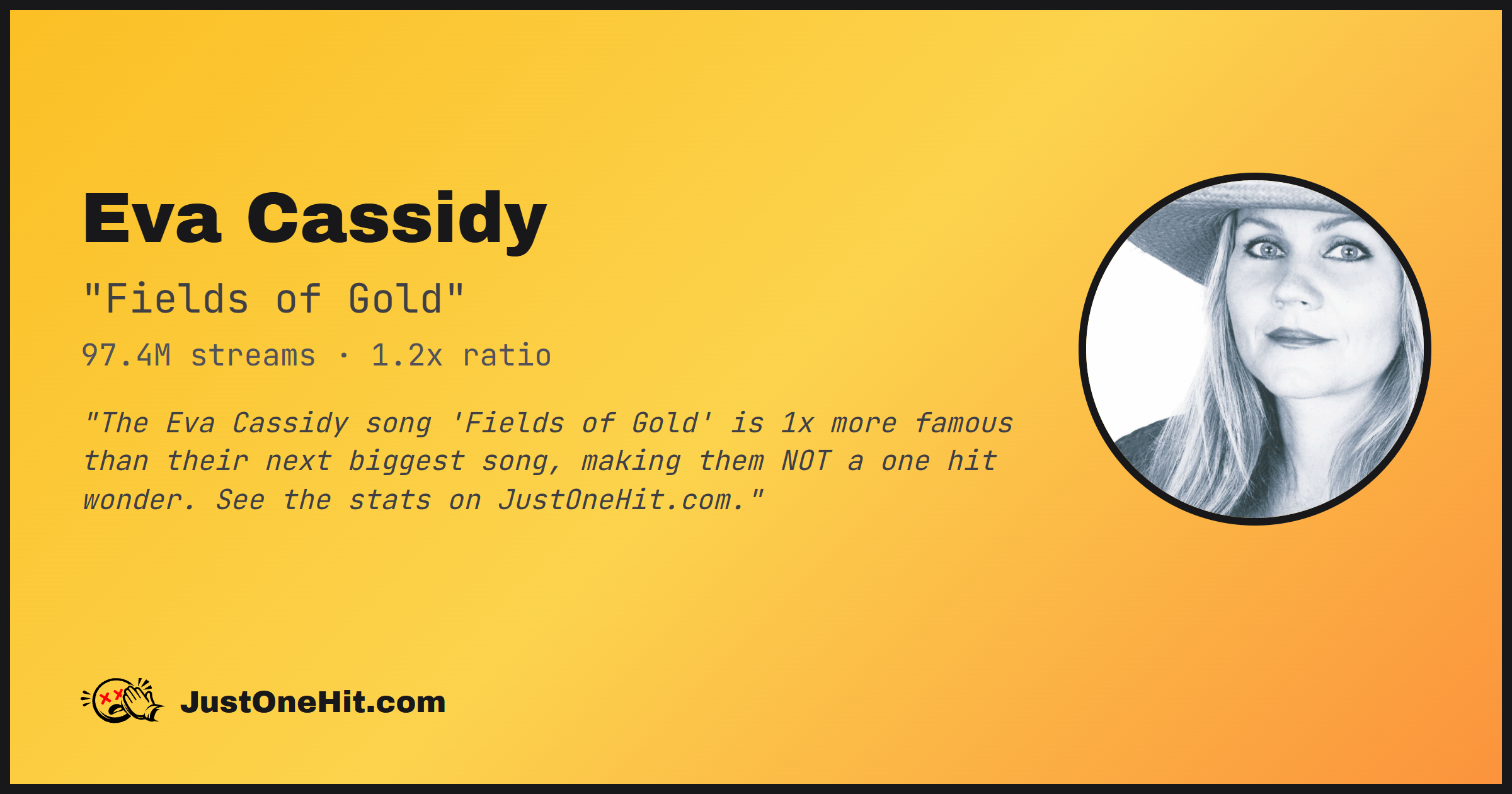 "The Eva Cassidy song 'Fields of Gold' is 1x more famous than their next biggest song, making them NOT a one hit wonder. See the stats on JustOneHit.com."