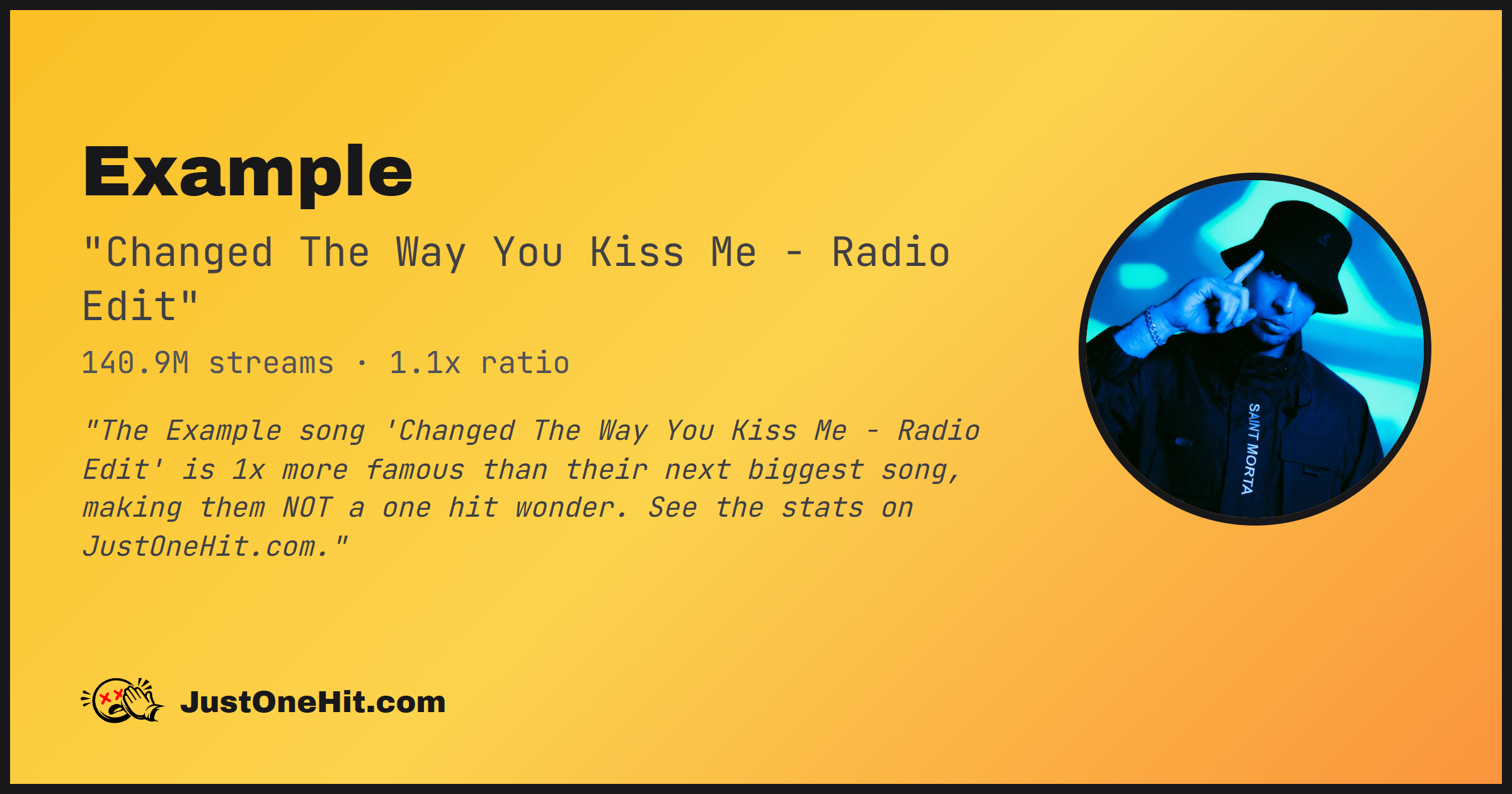 "The Example song 'Changed The Way You Kiss Me - Radio Edit' is 1x more famous than their next biggest song, making them NOT a one hit wonder. See the stats on JustOneHit.com."