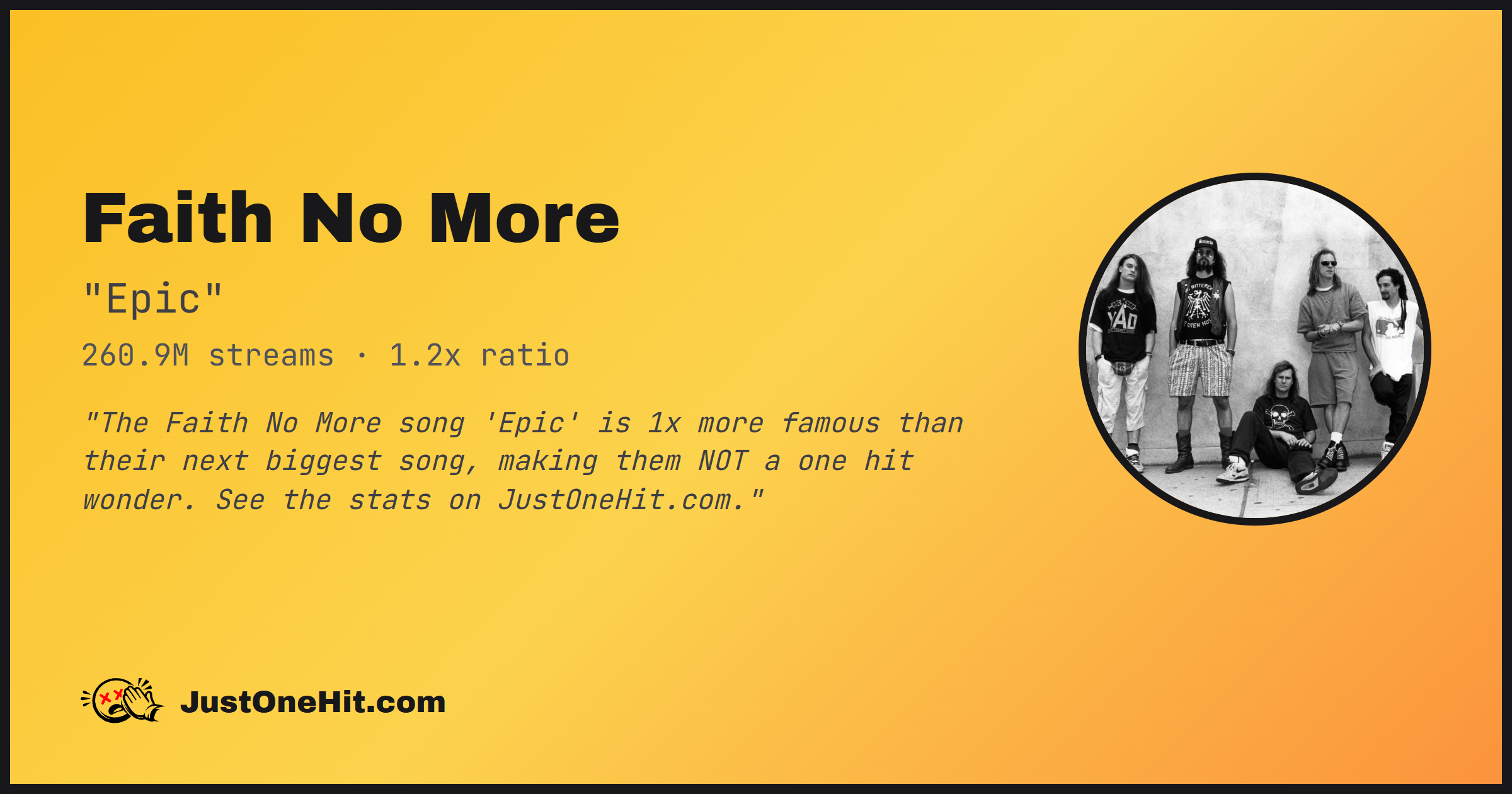 "The Faith No More song 'Epic' is 1x more famous than their next biggest song, making them NOT a one hit wonder. See the stats on JustOneHit.com."