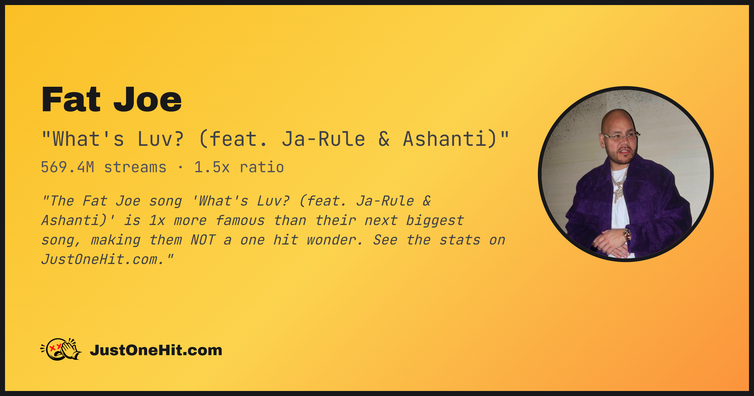 "The Fat Joe song 'What's Luv? (feat. Ja-Rule & Ashanti)' is 1x more famous than their next biggest song, making them NOT a one hit wonder. See the stats on JustOneHit.com."