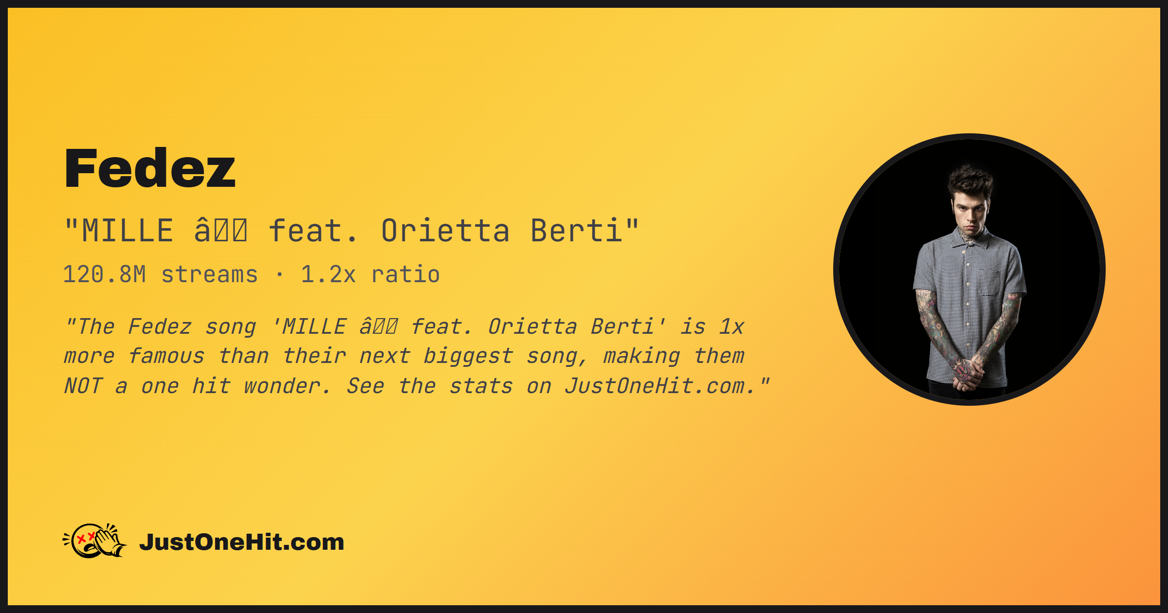 "The Fedez song 'MILLE â feat. Orietta Berti' is 1x more famous than their next biggest song, making them NOT a one hit wonder. See the stats on JustOneHit.com."