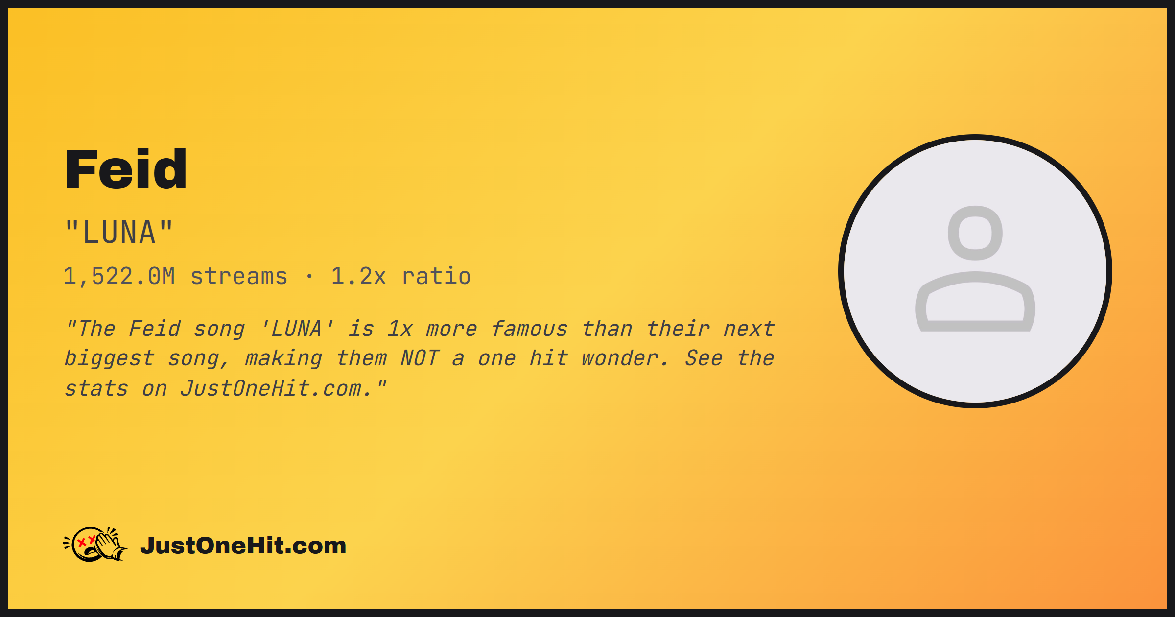 "The Feid song 'LUNA' is 1x more famous than their next biggest song, making them NOT a one hit wonder. See the stats on JustOneHit.com."