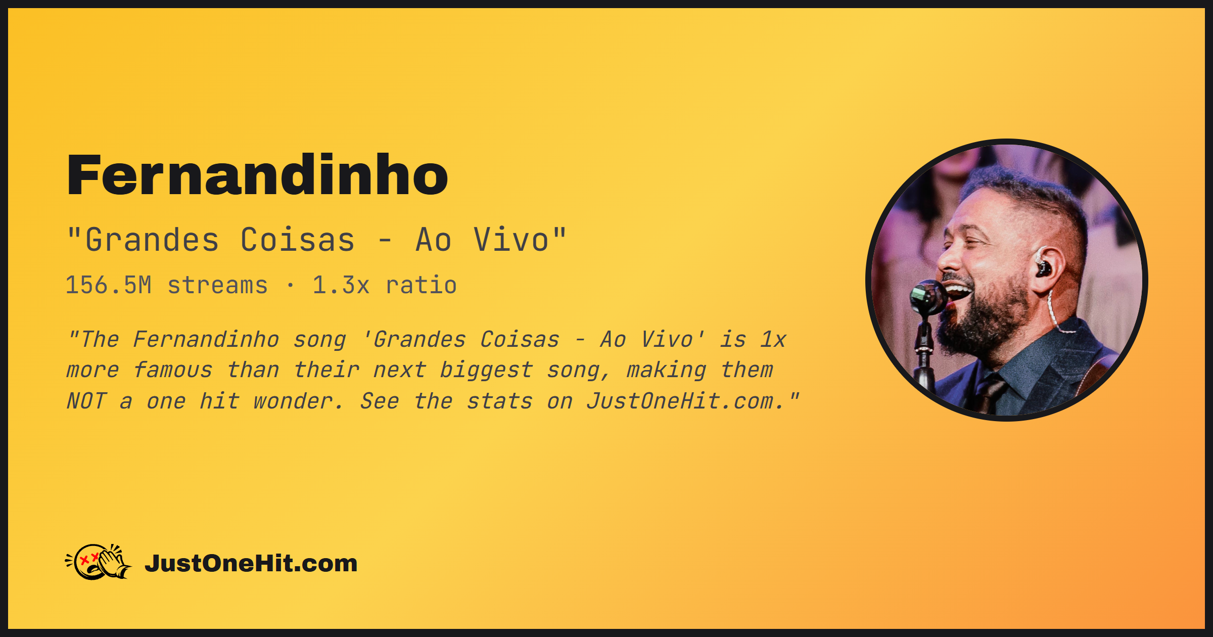 "The Fernandinho song 'Grandes Coisas - Ao Vivo' is 1x more famous than their next biggest song, making them NOT a one hit wonder. See the stats on JustOneHit.com."