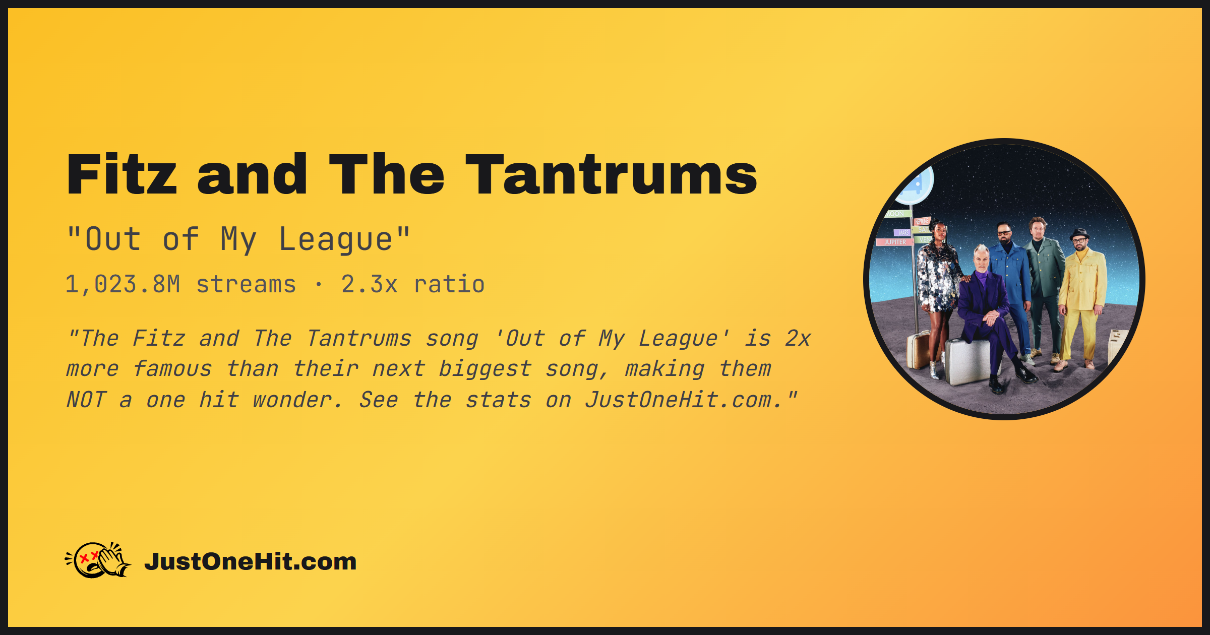 "The Fitz and The Tantrums song 'Out of My League' is 2x more famous than their next biggest song, making them NOT a one hit wonder. See the stats on JustOneHit.com."