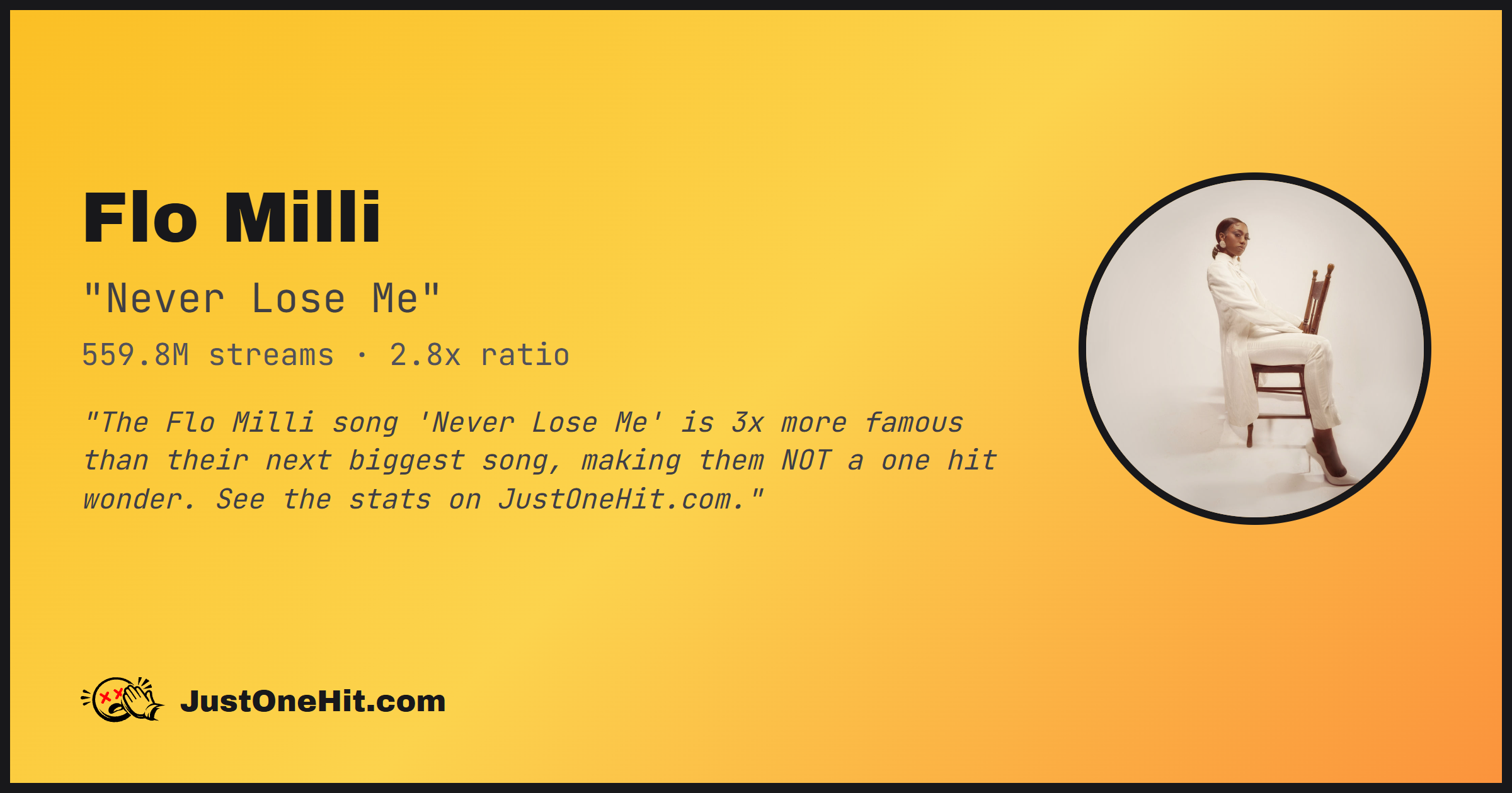 "The Flo Milli song 'Never Lose Me' is 3x more famous than their next biggest song, making them NOT a one hit wonder. See the stats on JustOneHit.com."