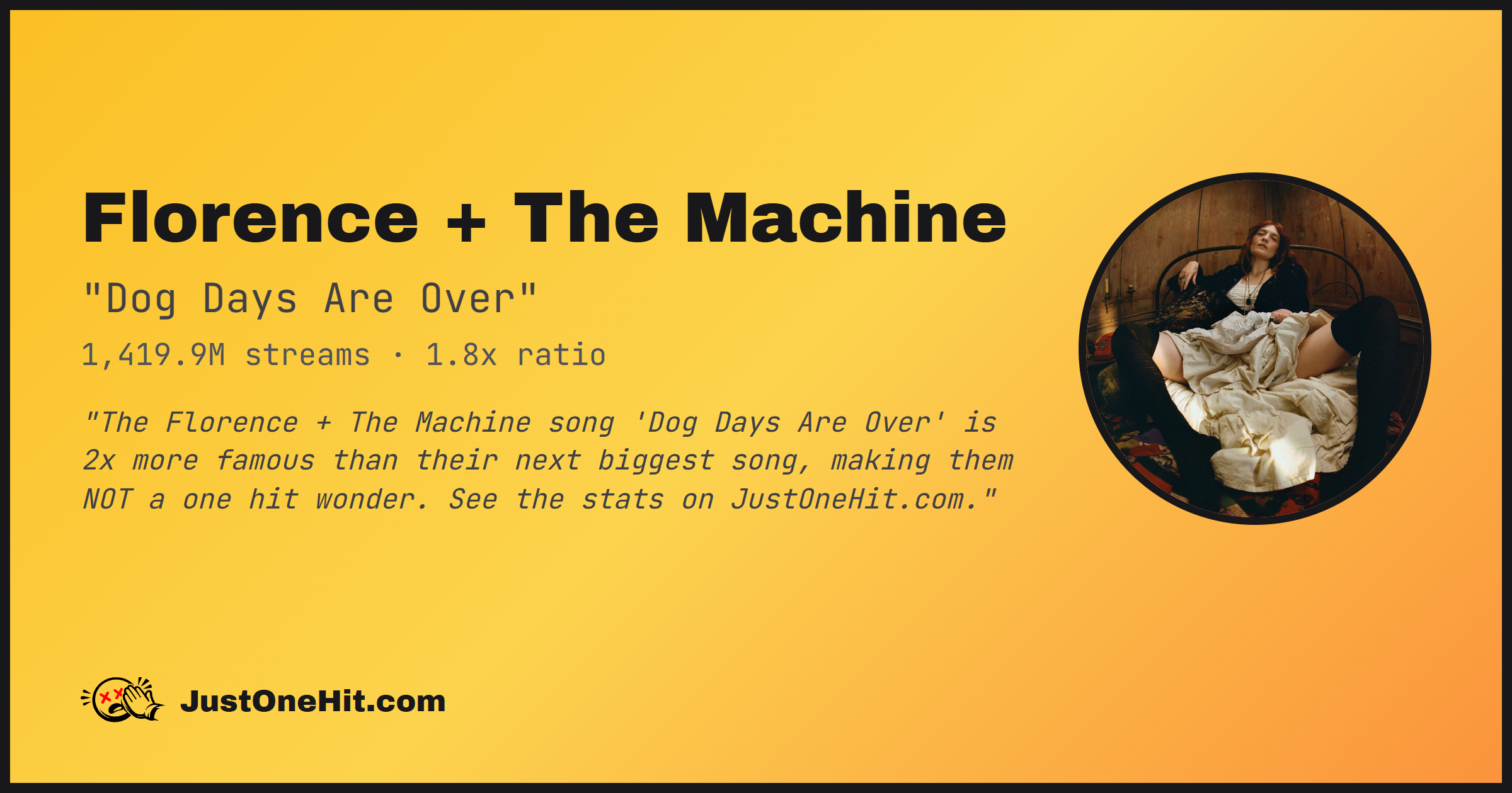 "The Florence + The Machine song 'Dog Days Are Over' is 2x more famous than their next biggest song, making them NOT a one hit wonder. See the stats on JustOneHit.com."