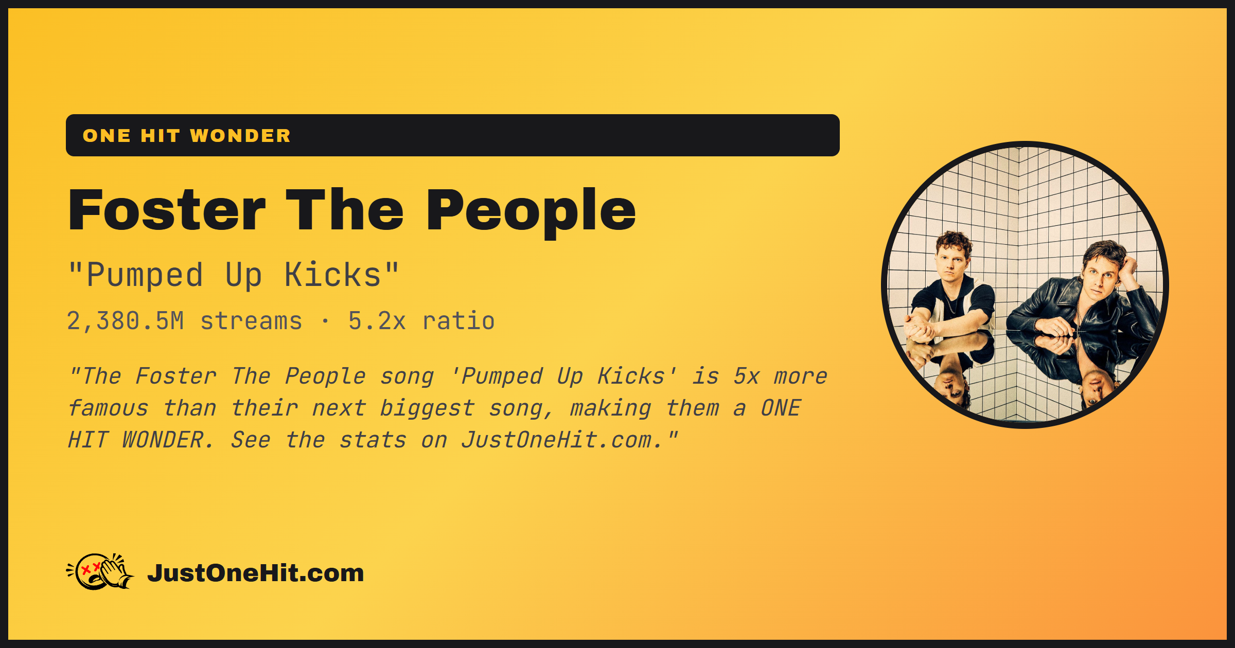 "The Foster The People song 'Pumped Up Kicks' is 5x more famous than their next biggest song, making them a ONE HIT WONDER. See the stats on JustOneHit.com."