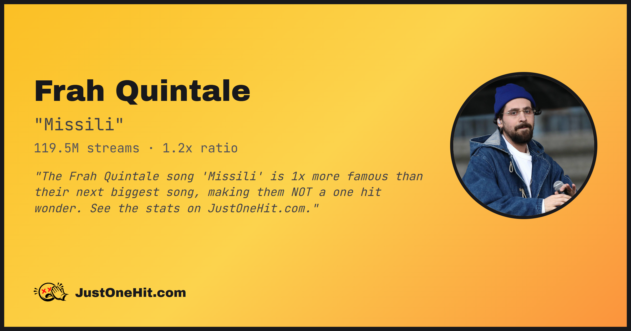 "The Frah Quintale song 'Missili' is 1x more famous than their next biggest song, making them NOT a one hit wonder. See the stats on JustOneHit.com."
